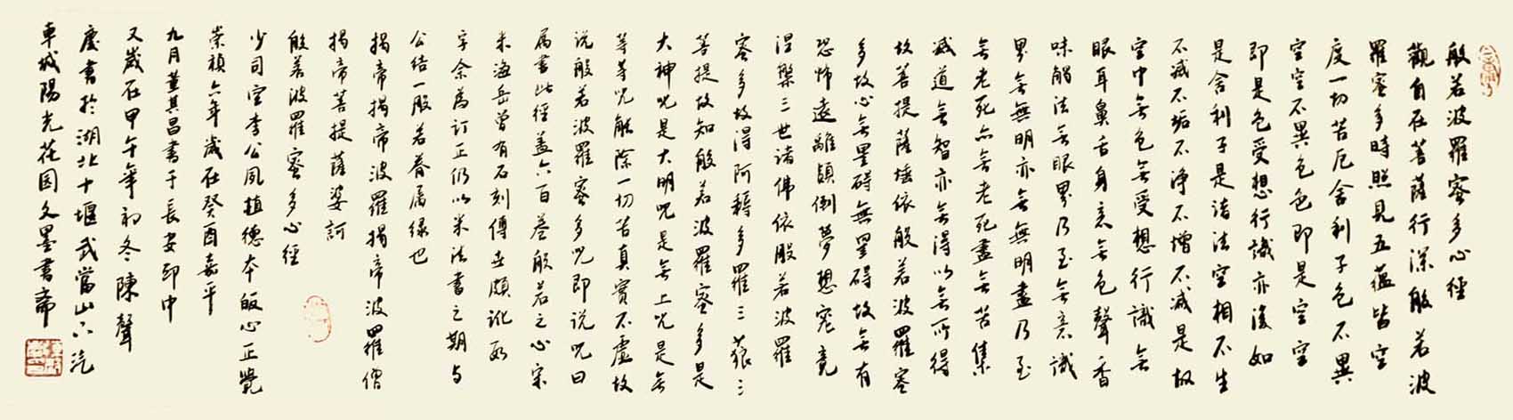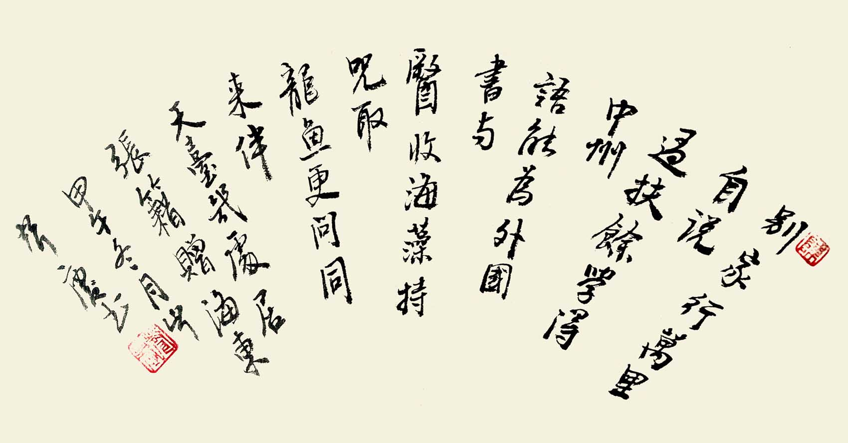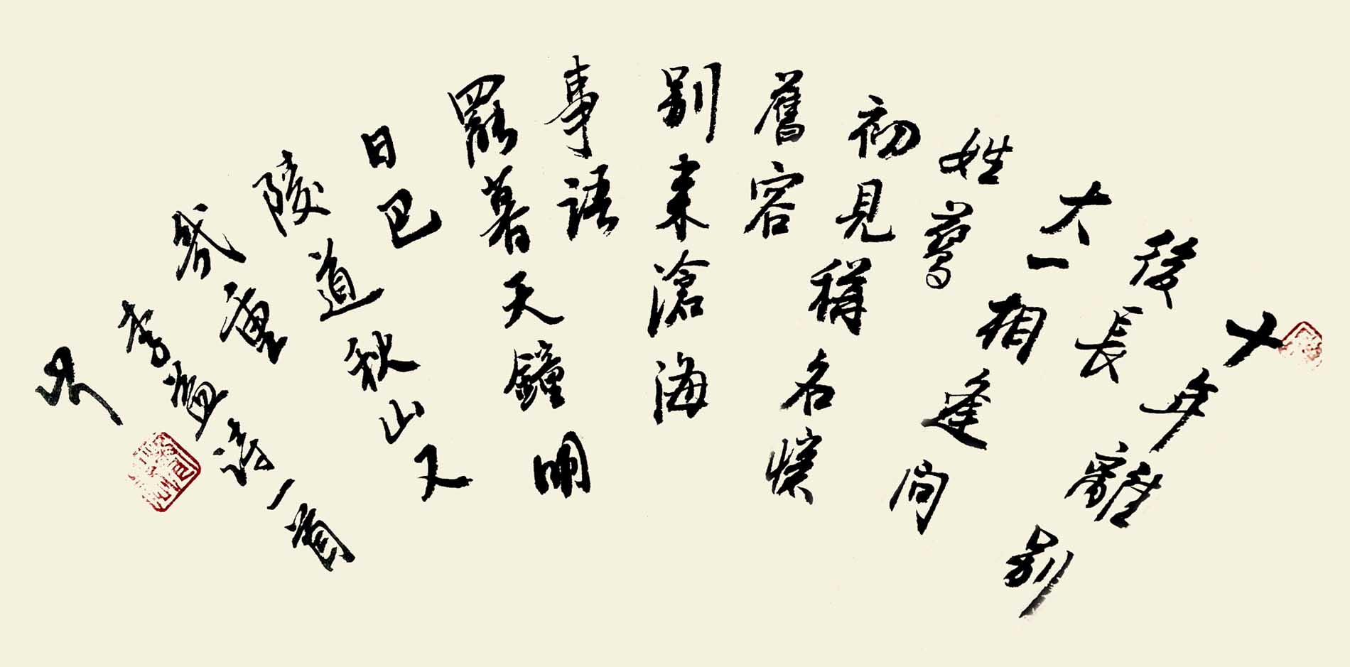 “文如其人”,古今中外莫不如此,“画为心声”—书法艺术更是直接反映作者的情性,气质与学养。陈声庆的书法在师承历代大家和当今名流的基础上,追本溯源,上下求索,二十余年如一日,丝毫不辍,博采众长而自成一家,书来肉丰骨劲、另具意趣。尤精于行草,他的行草中锋运笔,纵情挥洒,一气贯连,健劲跌宕,变化多资,于跌宕错落的体势中现出豪迈爽飒的风致。情为艺魂,诗词书画本以抒情言志为目的,他的书房中常挂诗词和汉魏碑志整拓,每于静心时面壁神游。一隅设有六柜书厨,内陈书籍有书法、辞典、诗文等各种书籍数千册。声庆虽在“文革”中没有机会潜心念书,但后来在部队一直孜孜读书习艺:所读书虽未足尽邺架惠车,而好学深思、自强不息的精神尤为敬佩。平常看到行云、流水、古藤、老树和别人跳舞的舞姿,他也联想到写字的笔法、态势,默默出神,暗自构想。有时一来激情,半夜起床挥毫泼墨。他书房中挂有一副对子“空室面对白贞纸,其有南屋墨生香”,这副对子表达了他对书法艺术的执着追求。他常讲:“人品好、书格高”,他的书法追求历史内涵与当代意识的统一和“笔到意不到,意到笔不到”的神韵及“人随明月月随人”的故技。他还讲:“搞书法创作要放而有胆,变而有理,习字谈书须骨气,盘根错节见精神;写书法一定要有好的思想品德”。因此,他的书法和他人一样英俊豪放。