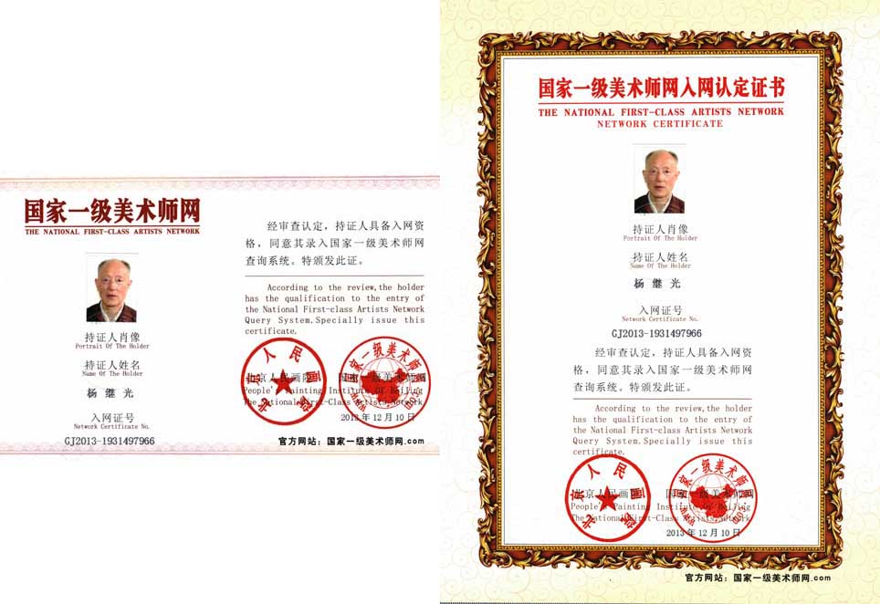 杨继光,男,1945年5月出生,原籍四川阆中人,毕业于安徽省徽州师范学校,任小学高级教师。中国世界华人作家艺术家协会会员、理事。中国翰林书画艺术院院士,北京华夏国艺书画院院士,北京尔康书画院院士。世界华人书画艺术家协会理事。自幼习书,中年始有研究,2005年发表书画作品。历年来十数次获全国书画大赛金奖、一等奖。特邀进京参加在北京全国政协礼堂艺术馆和香港中华书画研究院举办的“庆祝建国六十周年联谊笔会”,被授予“德艺双馨老年书画艺术家”荣誉称号。有大量作品入编各大赛书画作品集。2008年6月以四川汶川地震为题材发表诗作品《抗震》,荣获庆祝中华人民共和国60周年全国“中华杯”书画诗歌大赛优秀奖。2009年散文《父亲的回忆》获中国散文学会一等奖。诗词书画作品评为金奖入编《激情岁月·庆祝建国六十周年诗书画精品集》特评定荣获“建国60年——中国诗词、书画艺术奖”。2010年诗词作品五首在中国作家金秋笔会全国征文评比中荣获二等奖,入编《中国作家创作奖作品集(2010卷)》。2011年诗作品“庆祝中国共产党90周年”等被中国当代文学研究会评为一等奖,并入编《中国当代百名诗词家作品集》。2012年散文一篇,诗《山乡巨变》等,分别获中国“世界华人作家艺术家协会”二等奖;“祖国好”华语文学大赛一等奖;中华诗词艺术节两岸最高成果奖——紫金花金奖等。2013年,诗“光辉的历程”等获华夏博学国际文化交流中心主办的第十一届“中华颂”全国文学艺术大赛二等奖。业绩辑入《共和国功勋人物志》,荣获百佳自主创新成果杰出贡献奖,授予“科技明星”等荣誉称号。