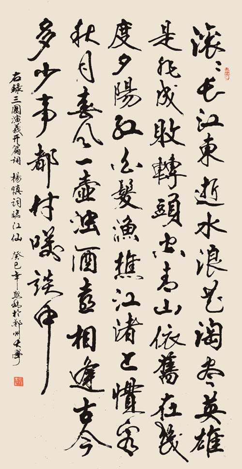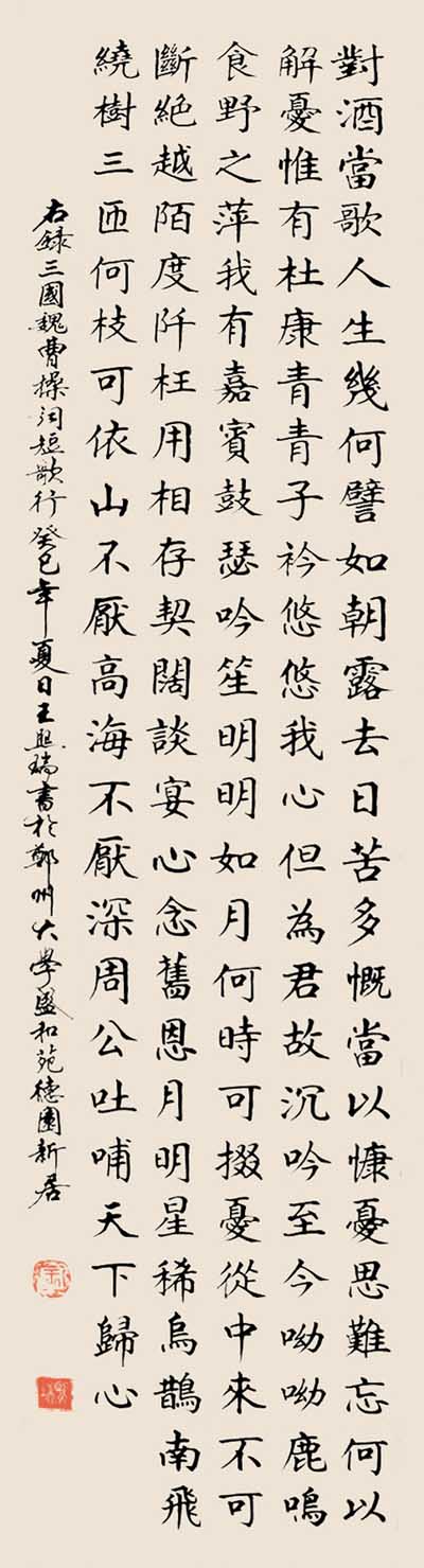 王熙瑞,1939年生,河南获嘉县人,郑州大学教授。从小受父亲和伯父的影响,酷爱书法,临贴颜柳兼习魏碑,初高中时期时常抄写板报和墙报。1968年被省教育厅抽去搞“毛泽东革命教育思想展览”,与省内的著名书法家一起工作,受唐玉润的影响颇深。