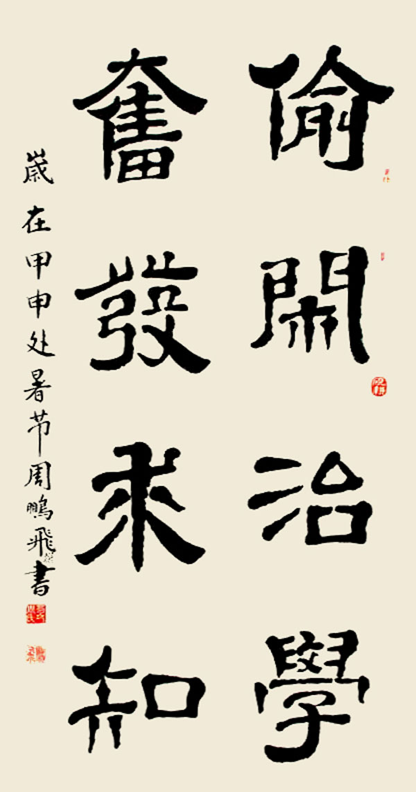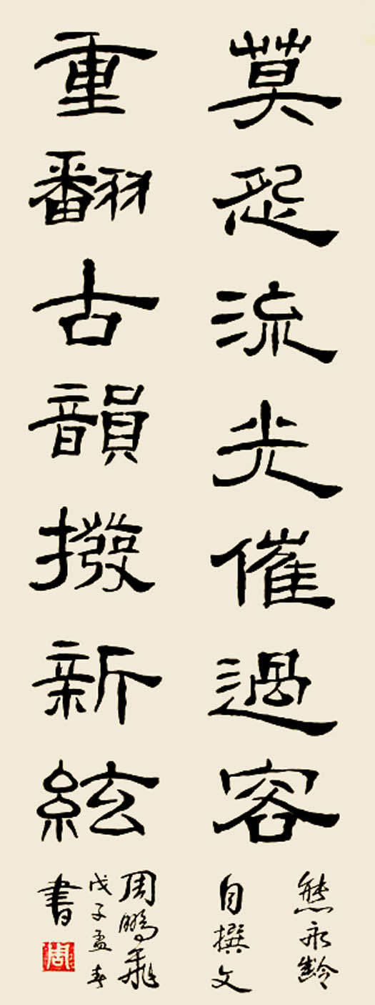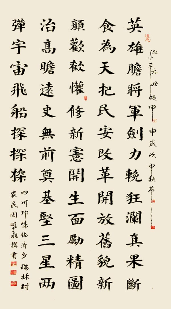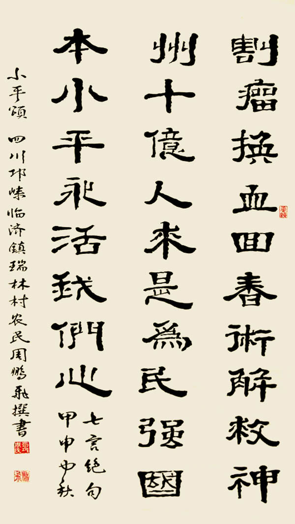 周鹏飞,笔名瑞林童,1940年2月生,籍贯原邛崃县大碑乡一新村。自幼跟父读书习字,父亲手把手的教我模写四大家正楷。五岁就可悬笔而书,每幅字过半合格。从读方块字起以至《国文、修身、论说精华、四书、五经》。10岁时,除五经外它书皆可通背。51年赶迁异地失学两年,53年插班复学两年,升考高小时成绩优异,因家庭成份而落榜。