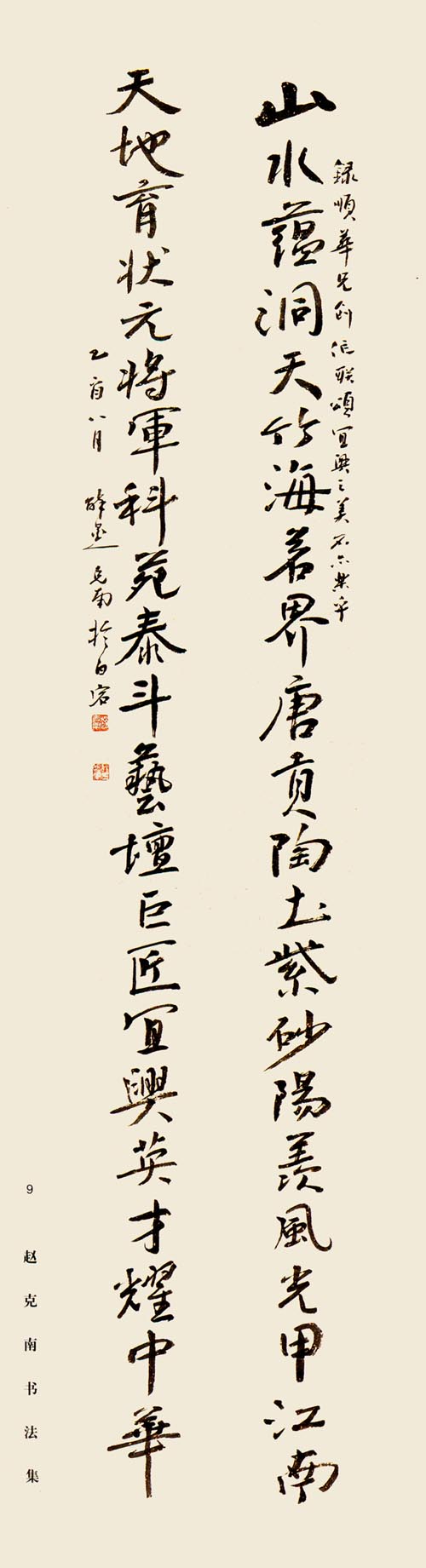 赵克南,2006年出版《赵克南书法作品集》,其书法作品多次参加国际、全国、省、市的展览并获奖,所书作品辑入《当代书法作品选》、《国际当代书法篆刻大观》、《当代书法家诗词墨迹选》、《中国当代书法名家墨迹》、《国际当代书法集》、《当代书画家作品鉴赏》、《中国当代艺术界名人录》等。被授予“世界杰出华人艺术家”称号。