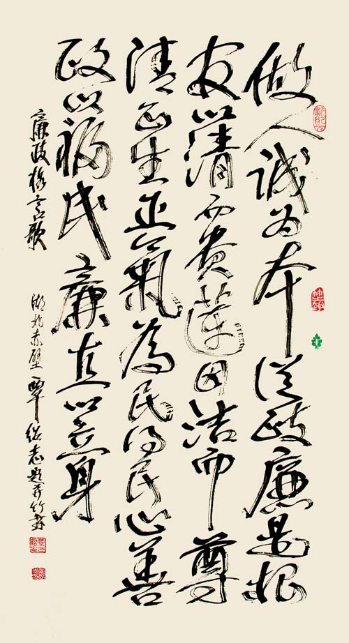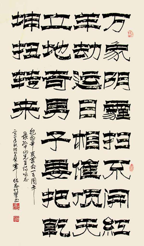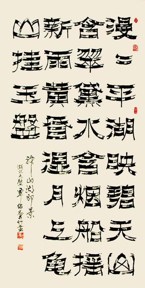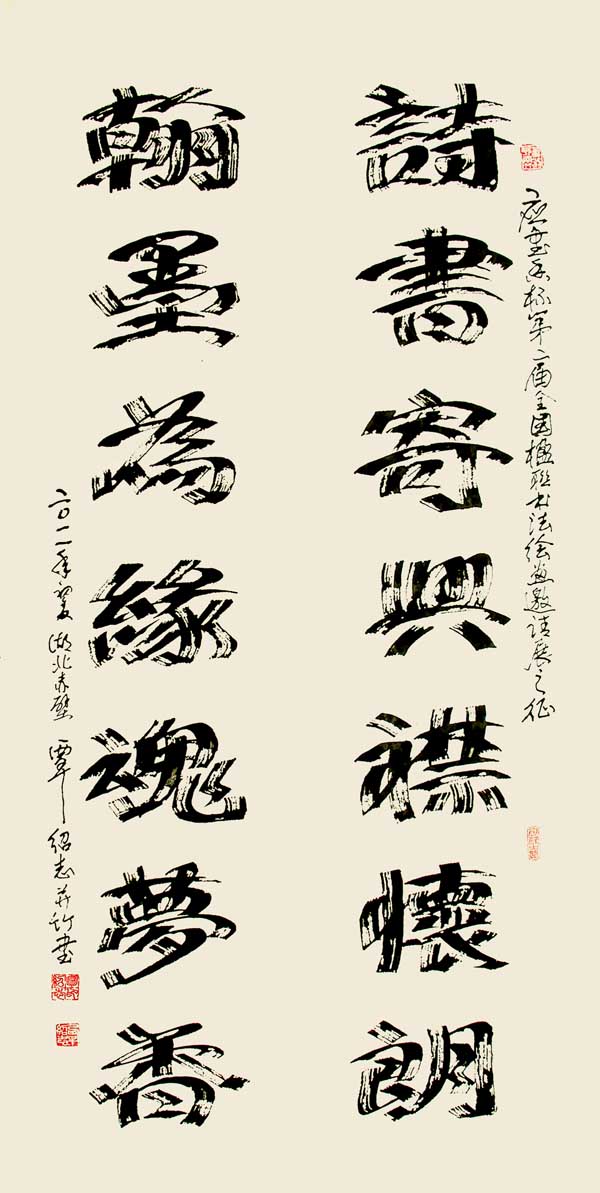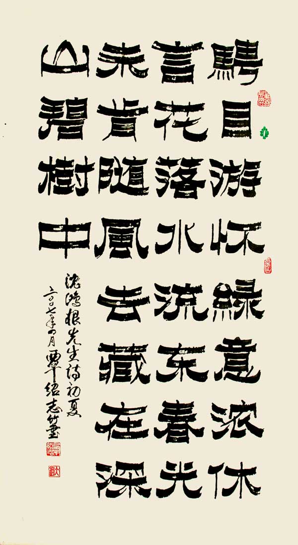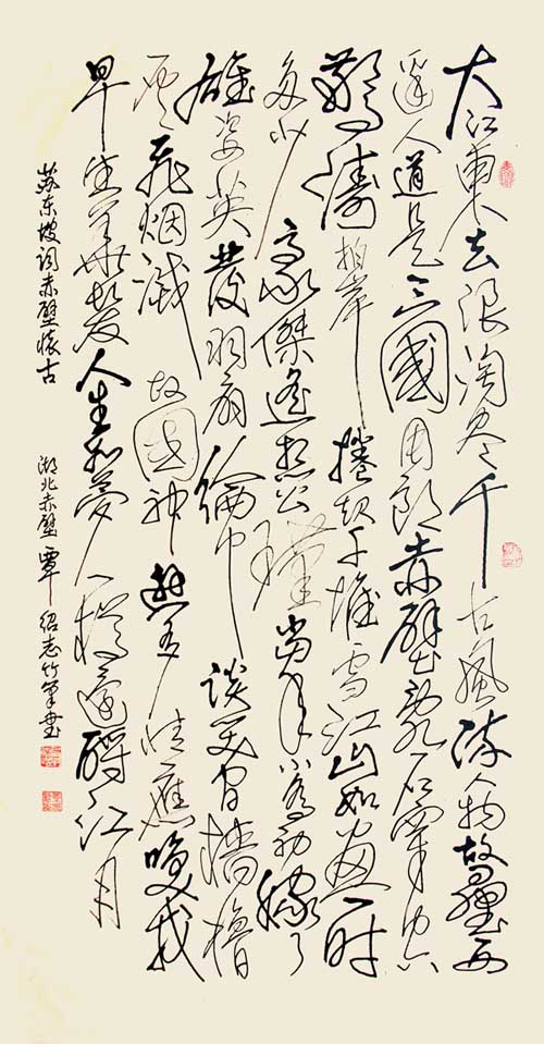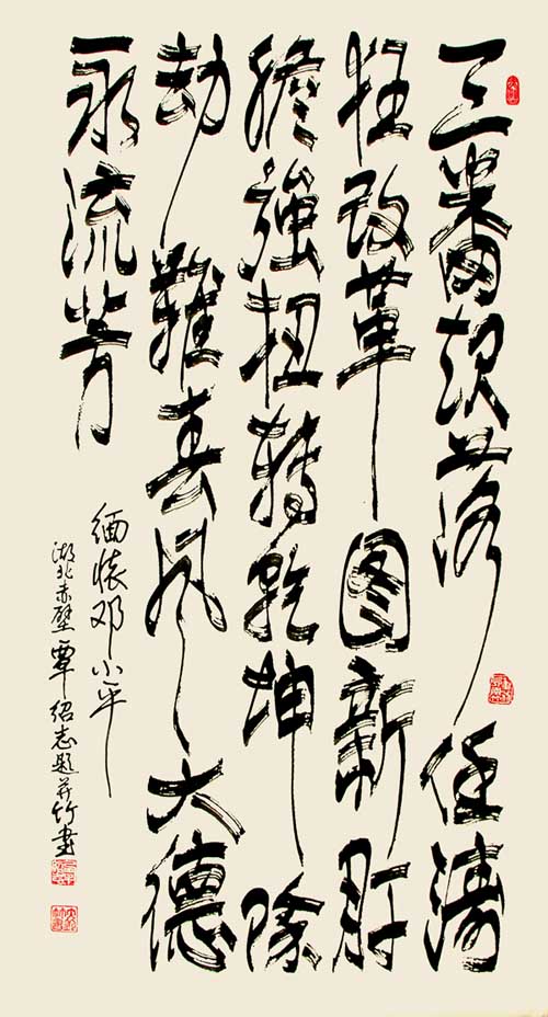 覃绍志,笔名覃群、东施,斋号苦竹楼。1938年11月生,湖北赤壁(原蒲圻)市人。系中国艺联副主席,中国当代硬笔书协理事,中华诗词学会会员,赤壁文学院副院长,一级书法师 。研习书法近50年,以上世纪60年代中期自创之竹笔书法为主。其“竹笔”字形能大能小,笔划可粗可细,篇幅能达六尺,纸质软硬皆宜,真、行、草、隶、篆五种字体都能写。它不但吸收了毛笔书法粗细方圆疾涩枯湿的优点,又克服了钢笔书法笔划细硬单一、只能写小字不能写大字的弱点,所创之“竹书”既具硬笔特色,又有毛笔韵味,其艺术风格独树一帜,以独创、新颖、唯一而著称,被誉为“鄂南一绝”、“中国竹书第一人”。其书法工具的创新,首次打破了千年的毛笔书写惯例,促进了书法门类的多元化,为我国书法艺术的发展开辟了一片新的天地。