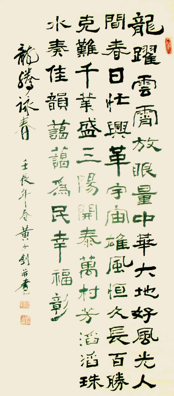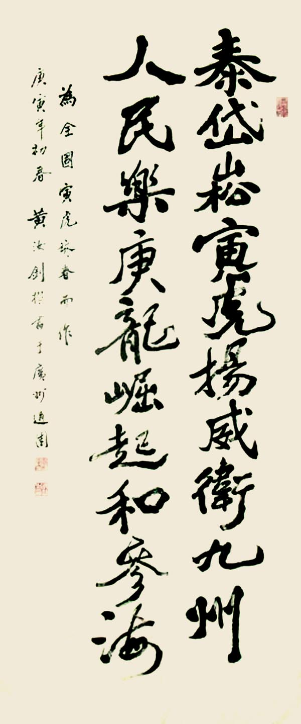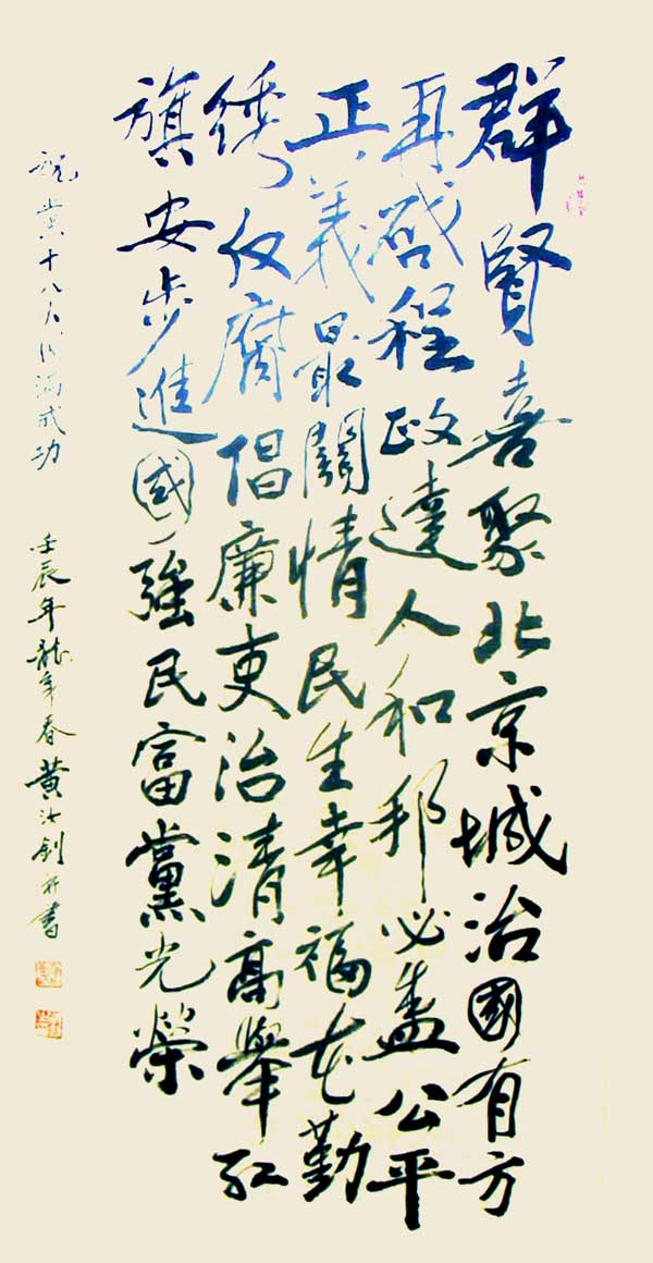 黄汝钊, 1928年生,广东省深圳市人。中山大学法律系毕业。原广东省人大常委会法律委员会委员兼法委办主任。离休之后,参加中国书画函授大学书法班、省老干部大学书法研究班、岭南诗社诗词研修班学习。现为广东省书法家协会会员,中华诗词学会会员、广东省岭南诗社社员,省老干部诗书画摄影研究会会员(原第一、二、三届理事兼书法会副会长),省人大机关书画会副会长。诗词作品在《秋光》、《韶音》、《广州诗词》、《岭南诗歌》、《人民之声》、《陆丰诗词》及北京《诗词之友》等刊物发表数十首。其中,长诗《寻母行》获中华道德建设诗词大赛一等奖中、《游帽峰山抒怀》获全国城市风光诗词大赛优秀奖。部分诗词入编西安《华夏诗存》北京《世纪诗词大典》、《中华道德建设诗词选》及中国文联出版社《新千家诗》。书法作品多次参展获奖和入编选集,2001年的《黄龙旭日腾沧海 紫凤驾云凌九霄》一付对联被深圳市档案馆收藏。2003年隶书“数风流人物还看今朝”(四尺宣)入编长沙毛泽东文学院、纪念毛泽东诞辰110周年全国书画大赛精品集。2012年《巍巍中华、纪念王羲之等四圣书画大赛》获金奖。2013年入编《北京华夏国学出版社聚集十八大中国百名文人题贺的荣誉特刊》。