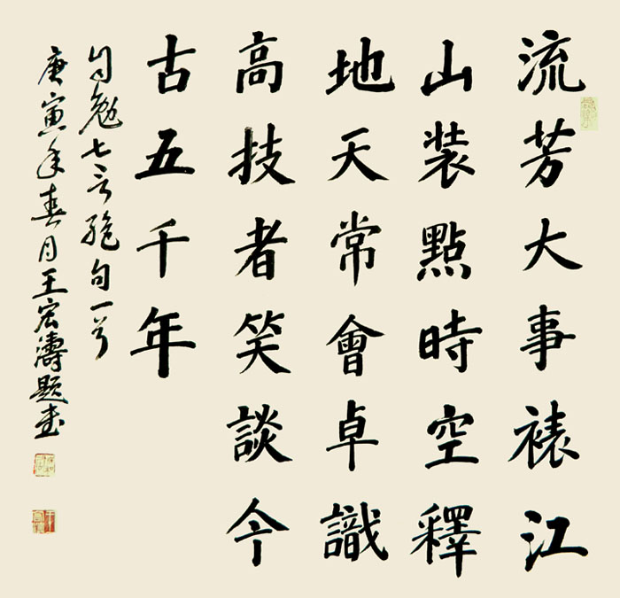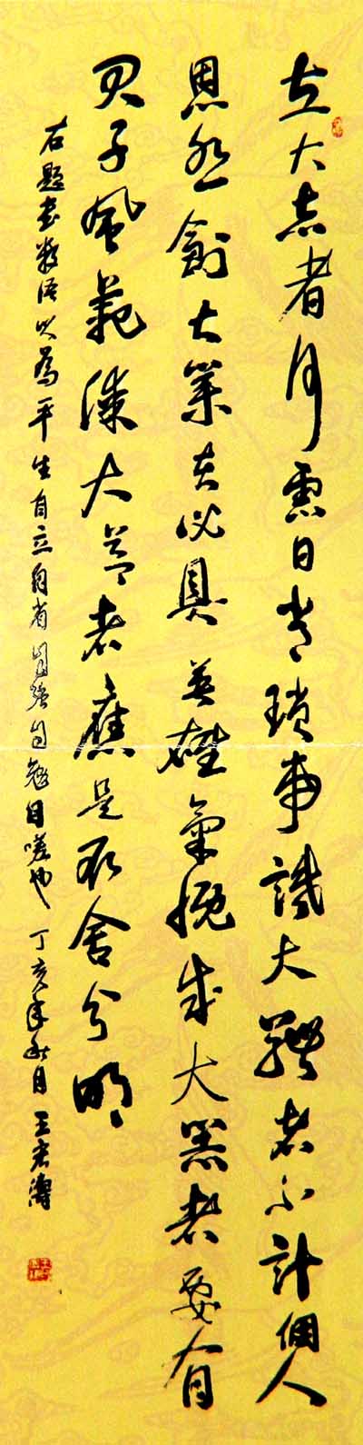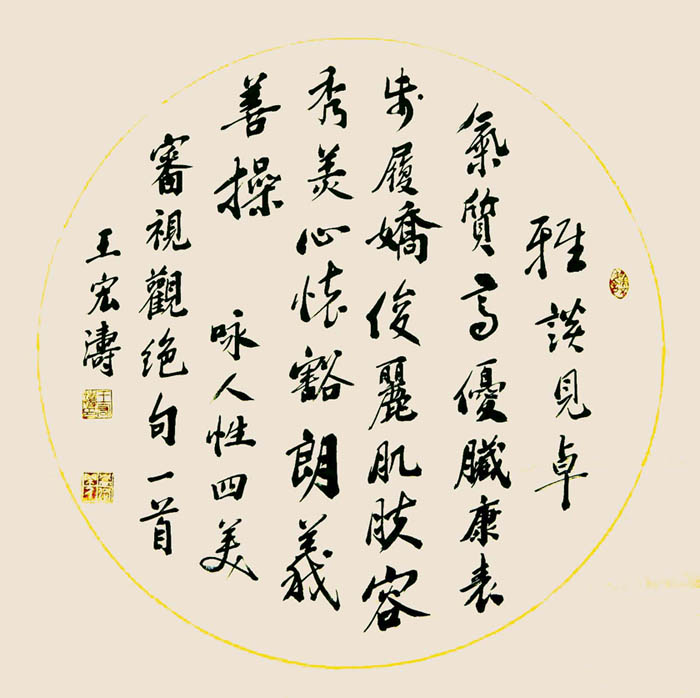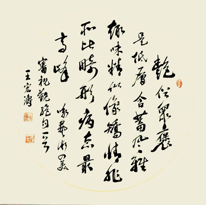 王宏涛,别名王红太,字金灿,号松岚,自署嵩洛痴叟。一九五四年十月生于河南巩义,幼承庭训,执笔涂鸦,初摹隶篆,继学二王,后习颜柳,遍访名师,唯求通神之妙。钟情诗文,研读百家,追风李杜,观今鉴古,意化天地、欲达纯青之望。研究周易,推算四柱,观宅点穴,五行择吉,起名改名,意在精确之志。苦心天不负,有志事竟成。