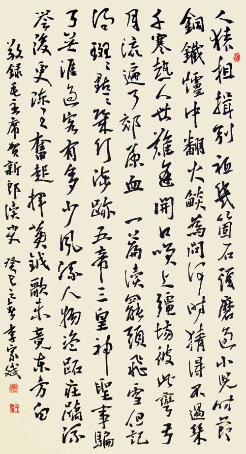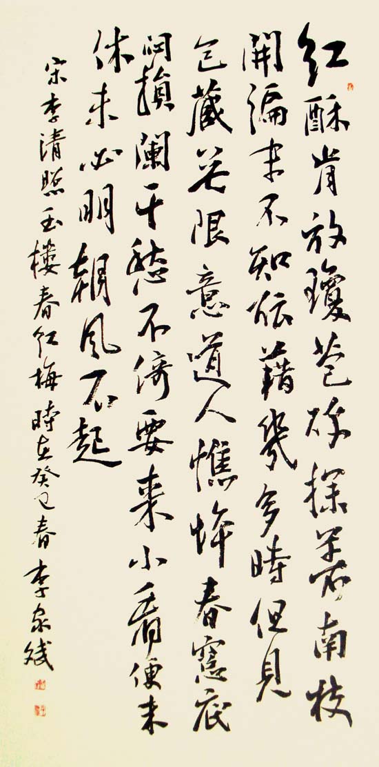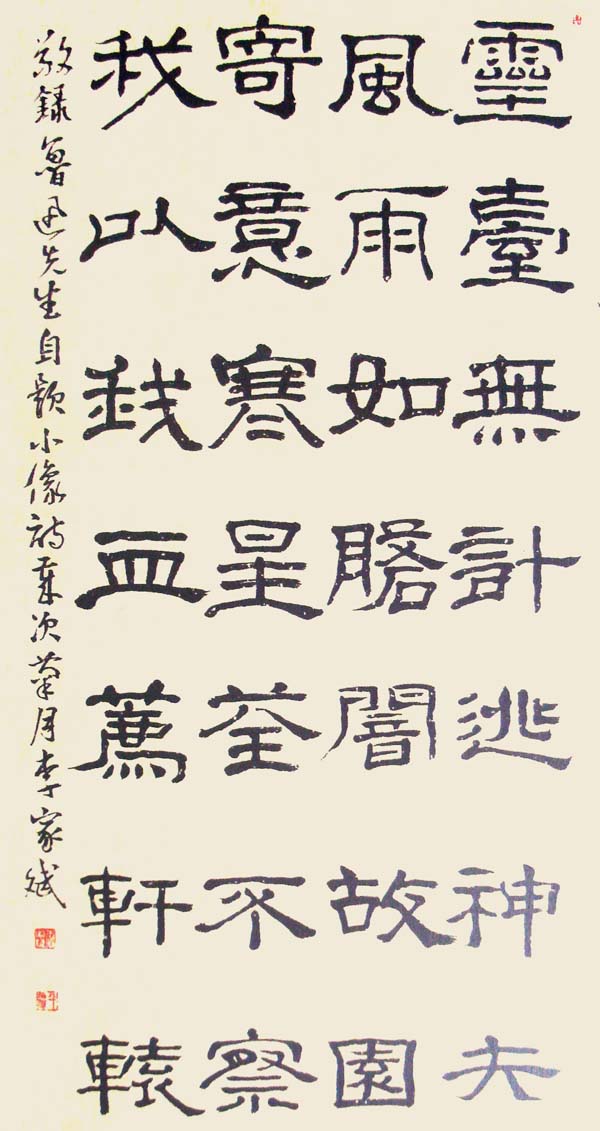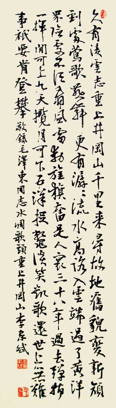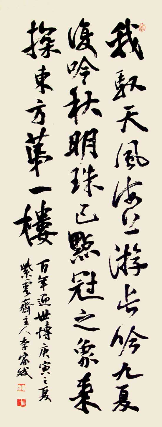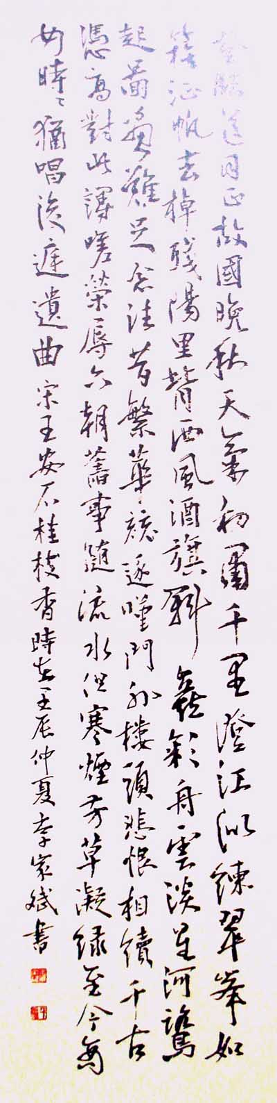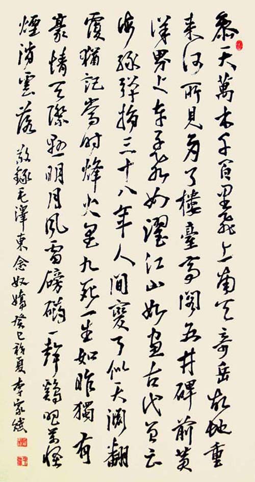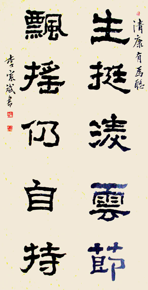 李家斌,男,1949年生于徐州,1987年毕业于无锡书法艺专行草专业。曾任徐州市硬笔书法家协会副主席兼秘书长,是徐州市硬笔书法事业的创始人;现为中国文人书法家协会理事、中国书画家协会理事、江苏省书谱研究会常务理事、江苏省书法家协会会员;当代中国实力派润格书法家;近获“金龙吟春”一等奖、“春天的故事”书画名家金奖、首届中华国粹论坛暨《兰亭序》问世1660周年中华诗书画大赛创作一等奖、“国之瑰宝”书画大赛金奖、“伟大旗帜”全国书画大赛金奖、“日出韶山”中国书画名家作品大赛金奖、第二届“炎黄杯”国际书画艺术大赛金奖、“唐诗印象”首届全国专题书法艺术展书艺百强、“千年宋词”第二届全国专题书法艺术展书艺百强,入选《书法百家》、《唐宋雅风100家》2012年第二卷;中国千字文书法大展入展,第30届伦敦奥运会---中华国粹题贺艺术奖---甲级作品,“梅花报春”第四届全国诗书画印四绝大赛中华梅花艺术奖---书法创作一等奖、“中华颂竹”诗书画大赛一等奖、“隶书杯”中华同体书法创作竞赛隶书百佳提名奖、东方红---纪念伟大领袖毛主席诞辰120周年国礼珍品中国书法红瓷艺术大赛金奖、第五届“民族情”全国书画艺术大赛金奖、国粹杯---纪念毛泽东同志诞辰120周年中国实力派艺术家精品展特等奖、入编《中国书画名家大典》等;2010年度“榜样中国”大型艺术系列活动 “特等奖”,被誉为当代艺术界典范人物,并被中国书画研究院授予“榜样中国--中国知名艺术家”荣誉称号。