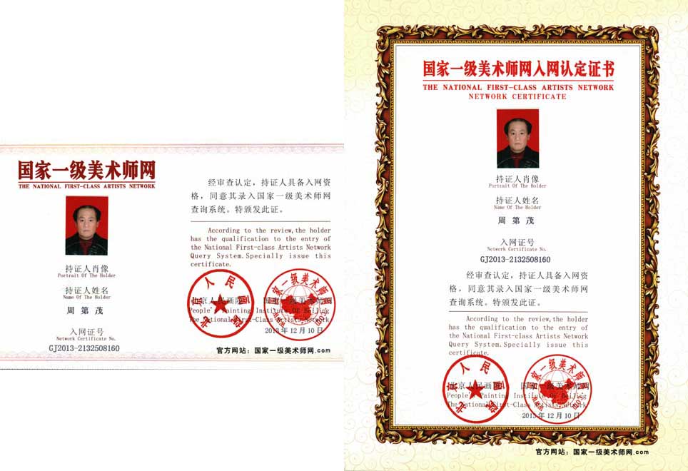 2006年6月在纪念毛泽东逝世30周年“毛泽东诗词全国书画大赛”中,他的美术作品荣获银奖,其作品入编《毛泽东诗词全国书画大赛优秀作品集》。当届评委会授予了周第茂同志“中国当代书画名家”的光荣称号。尔后,先后被“国际启功书画研究会”聘为研究员,湖南省直机关书画家协会创作中心“高级书画师”。2006年12月其书法作品荣获