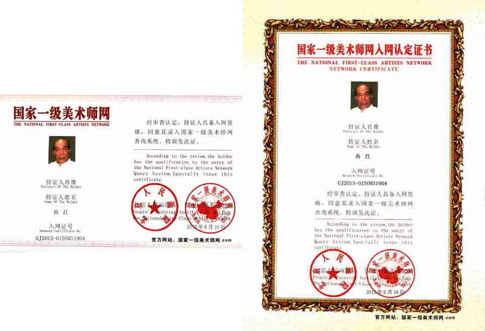冉江现为国际华人艺术大师、中国高级工艺美术师、中国艺术家协会副会长、日中艺院艺术顾问、桂林书画院副院长。受聘于河北省工艺美术高职评委,原保定市工艺美术学会秘书长,古今工艺美术研究院院长等。