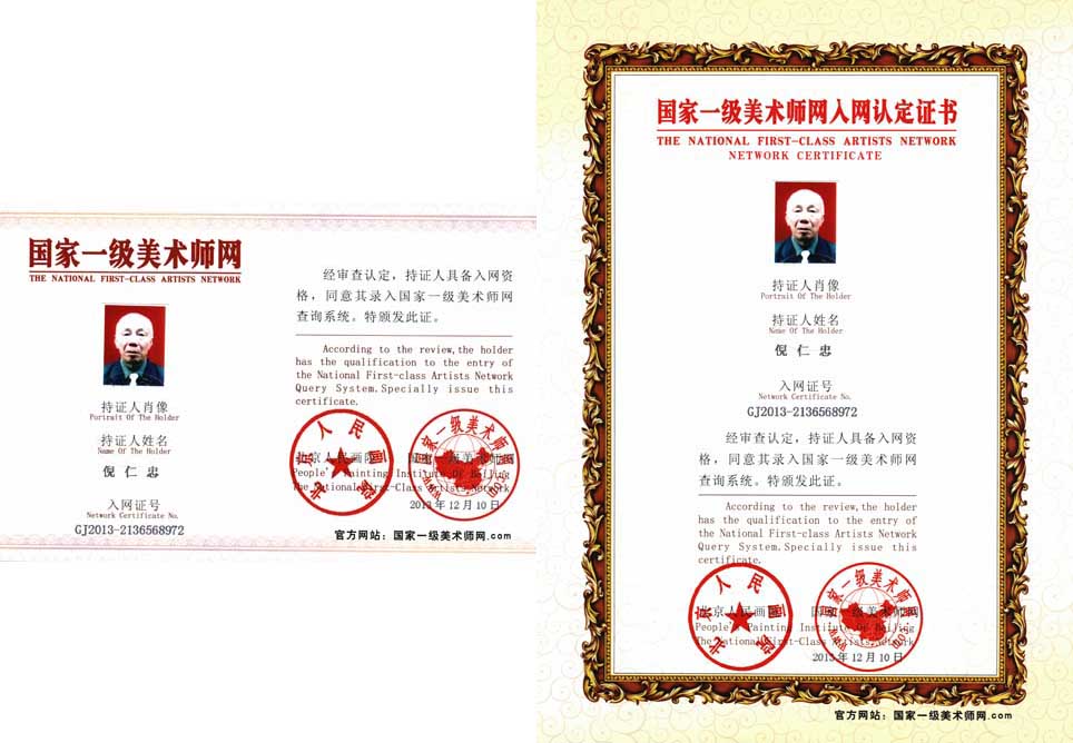 倪仁忠,浙江富阳常安镇安一村,男,汉族,生于1935年10月,六年小学文化,参加书画组、世界书画家协会理事组织部领导、世界和平经济共同体会员、国际文艺界联合会高级院士、世界第二次文艺复兴先驱者共21名人选、宋庄国际书画院终身院长、南京长江书画院名誉院长、大坂国际书道会荣誉理事、中外书画鉴赏家、北京艺术中心书法师、三味书画院院士高级书画师、中国王羲之基金会书画诗联学会理事、上海中华书协会员等三十多家,书画组织荣誉证书,国际、中外、现代、书画精英骨干、特约书画家、英格兰皇家艺术基金会永久学术顾问,世界文化艺术金像奖,世界文化艺术五星级艺术家,国际文艺杰出贡献奖、中外友好文化使者、中华民族杰出艺术家(金奖)、首届世界华人美术奖(终身成就最高荣誉奖)、齐白石艺术奖(金奖)邀请参加中日书画交流精品展、终身成就世界华人艺术名家荣誉称号、特授予世纪英才、中国艺术泰斗终身成就奖、海峡两岸名家名作金奖、全球华人最具影响力艺术家荣誉称号,中华名人艺术形象大使,被称誉中国人民艺术大家,中国当代书画名家,上海世博会荣获金笔奖,金玉杯。荣获首届全国诗书画大师成就奖、荣获国际文艺界联合会最高荣誉金圣奖、中国文艺泰斗终身成就奖、中华文化艺术复兴奖、终身贡献奖、世界华人艺术领袖荣誉称号、中国人民志愿军抗美援朝60周年金奖、长征70周年金奖、国歌创作一等奖、庆祝中国共产党90周年金奖、辛亥革命一百周年金奖、世博有我巡回展一等奖、纪念毛泽东、周恩来、邓小平、孙中山、吉鸿昌、鲁迅、王羲之、颜真卿、草圣怀素、雷锋、都荣获大奖,入选、入编、入展、为奥运会作品三金一银、义卖支援四川汶川灾区、荣获奥运火炬奖杯、毛主席在延安文艺座谈会上发表65周年金奖、广西钦州港开港金奖。2010年8月15日到8月19日参加上海世博彩风团百名书画家,雷正明为团长,北京参会二次,2005年之2008年,另外收到各类邀请一千多封,入编各类书画集300多部。北京国家邮政总出版个人人头邮票3次,并在世界公开发行世界第二次文艺复兴功臣榜人选,世界七大洲入围540名。中国大陆3名,已入选《世界名人录》荣获终身成就荣誉称号。
