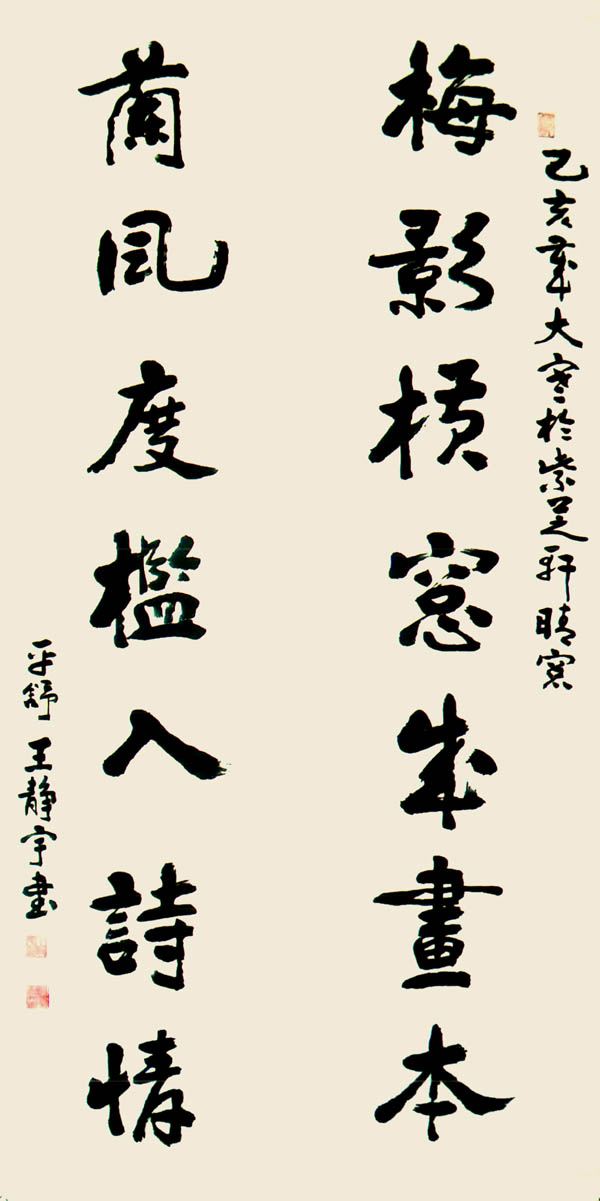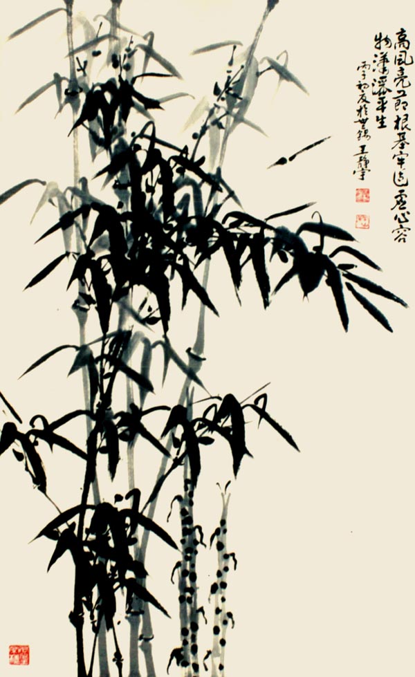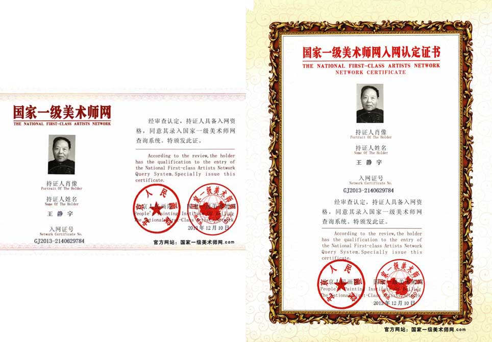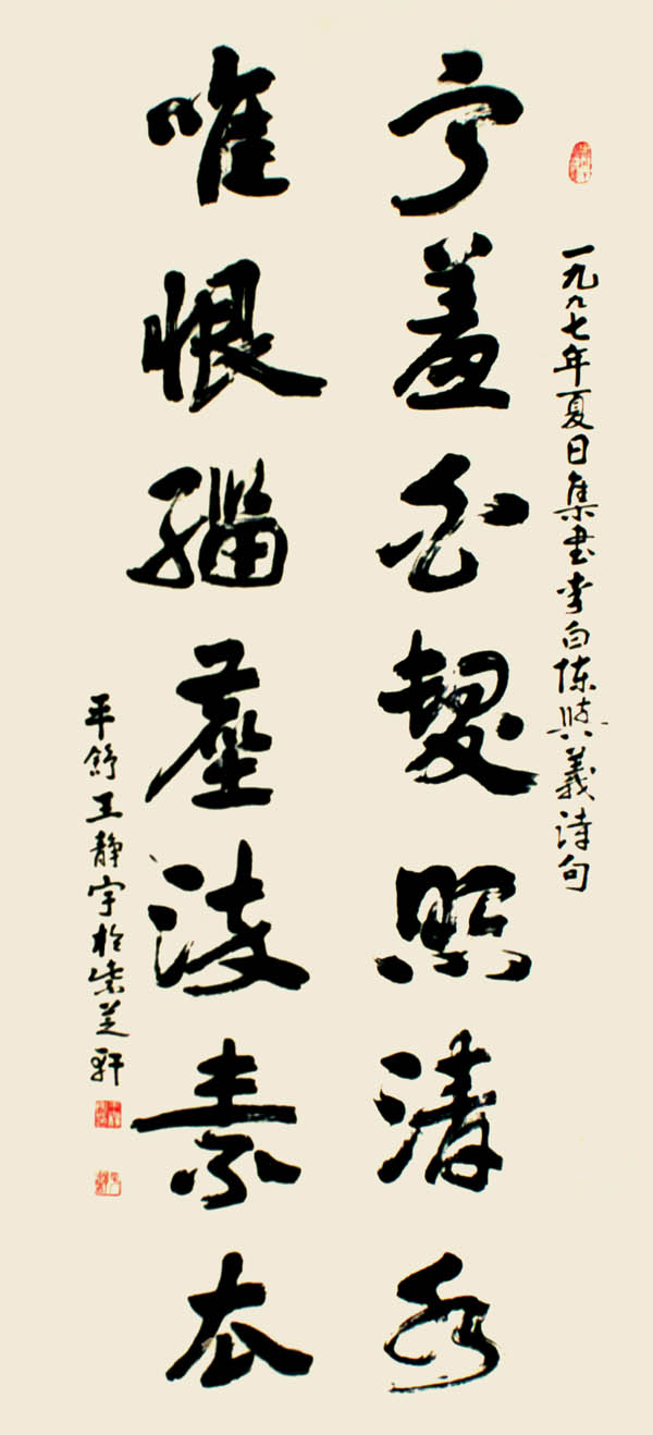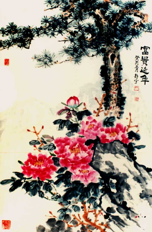 王静宇,一九二三年生于河北省冀中平原农村,现已年届八旬,平生干过多种革命职业,然而现在却一来二去地被人们称之为“书画家”了。说起来我与书画确实是有缘分的,这要从少年时代说起:当时,我家虽非名门望族,但在经济上颇为殷实,可算是耕读之家,有读书人,且拥有大量的书画古籍,长辈们随时言传身教,从而使我对书画发生浓厚兴趣,上学时更是心迷手追。十五岁时“七·七事变”,日寇入侵,殃及家乡,家中全部房产在战争中被付之一炬。从此我就进入了严峻艰苦的门争环境。在当民主小学教员期间,从事地下抗日活动。接着参加了人民军队转战四方,受到无比深刻的教育和锻炼。一九六六年从部队转业地方参加工业建设。在这近五十年的曲折经历中,何当有机会重圆旧梦。直到一九八三年在无锡离职休养之后,才即刻收整思绪转入书画学习活动,心无旁务地埋头了二十年。自觉这是过得非常充实、非常有意义的一段时光。