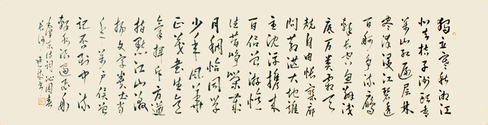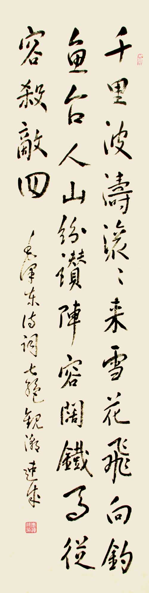 自幼酷爱书法,1980年正式学习书法至今无辍笔。楷书学习颜真卿。行书学习祭侄文稿唐李邕李思训碑,王羲之圣教序。草书学杯素小草千字文。王羲之十七帖,孙过庭书谱,隶书学习史晨碑,篆书学习邓石如千字文等。草书转于右任。擅行草、榜书等。