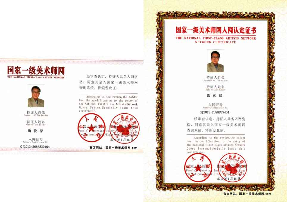 陶俊禄,笔名乐涛,1942年生,山东威海人,国家一级作曲家、一级美术师、教授。曾任枣庄市政协、文联委员,侨联常委,市八大业余艺术团总监,艺术指导,音乐家协会主席,艺术馆业务馆长等。现任:中国音乐家协会会员,中国社会音乐研究会会员,中国合唱指挥协会,中国音乐著作权(国际)协会会员。中国国画院鲁南分院院长,中国国际画院终身副院长,中国国家书画院副院长,中国工艺美术家协会名誉主席,北京国艺粹宝书画院名誉院长,中国台北故宫书画院终身名誉院长客座教授,中国书法美术家协会会员,中国东方神州书画院院士,东方国际名人书画院高级画师,泰山艺术研究院教授,世界艺术家协会副主席,中国文化报,香港《中外名牌》杂志社特约记者。国际杰出专家委员会委员客座教授,中国国画院院委兼北京京华兰亭书画院名誉院长。中国管理科学院专家委员会(行业)首席专家客座教授,中国书画收藏研究院研究员,中国名家书画院名誉院长,香港科学院国际艺术学院顾问客座教授。中国书画名家创作院荣誉教授,国际美术家联合会会员,新加坡国“新神州艺术院”院士,国际知名艺术家等。自幼酷爱音乐,美术。50多年来从未辍笔。创作的声乐作品经发表、演唱1千多件,戏曲、舞蹈、电视剧及专题片音乐50多台(部)。代表作《我的家乡在山东》84年获全国征歌一等奖,入编《当代青年喜爱的歌》歌曲集,山东歌舞剧院保留节目。由中央人民广播电台及全国各省市电台每周一歌播出,先后由任桂芳、彭丽媛、等100多名歌唱家演唱。音乐及美术作品获省级以上各种奖励100多项,国家级奖励48项。多次受中国文化部,中国民委,中国文联嘉奖。传略及作品入编《世界名人录》(中国卷)《跨世纪著名书画艺术家大词典》《中国翰墨传世名家名作》《两千年中国艺术家长卷》《中国中老年书画名家作品大典》《中国艺术市场当代最具收藏价值名家榜500强》《共和国拓荒者--全国优秀老干部图鉴》《中国当代音乐界名人大词典》《中国当代名人录》《中国音乐家名录》《共和国功勋人物风采》《共和国不会忘记》《世界人物辞海》《辉煌人生丛书》《精英集粹颂中华》《共和国杰出国学专家名录》《世界艺术大师辞典》等50余部大型辞书中。历年来由国际中华文化艺术协会及中国书画研究院,世界杰出华人联合协会,中国书画家联谊会等有关单位分别授于“优秀中华文艺家”“翰墨中国艺术名家”“百名中国书画名家”荣誉称号同时被评为“2005中国书画年度人物”授于“中国书画名家”“中华当代杰出功勋艺术家”“中国国学家”等荣誉称号。2006年以来被评为“中国当代杰出书画家”并获“中国当代书画艺术杰出成就奖”。2010年入选“共和国不会忘记--共和国英才”专题系列邮票同时授予共和国优秀领导名人荣誉称号。在历届大型展出中,分别获得特别金奖,金,银,铜各类奖50多项被国际文联和中国文化部授于“全国首批文化和谐使者”及“中国文艺终身成就艺术家”荣誉称号。国画《年年有余》《六顺图》《神仙》入选《红色中国》获奖精品集,《鸿运当头》获特别金奖及终身成就奖。在全国首次“风云人物”评选活动中,被评为“风云人物”金奖。2010年12月荣获由中国文艺家协会,中国知名艺术家协会,中国书画艺术家协会,中国诗词书画研究院,中国文艺泰斗终身成就奖评委会颁发的“中国文艺泰斗终身成就奖”同时授予“中国文艺泰斗”称号。2011年8月荣获由世界教科组织联合协会颁发的“人类杰出贡献奖”并授予“世界华人艺术大师”称号,2011年10月1日被世界教科文卫组织特聘担任“世界教科文卫组织首席艺术家”,并担任“艺术委员会执行委员”职务。3副国画作品,在参加2o12伦敦奥运之旅中国当代书画艺术展活动中,经“世界中华民族文化艺术联合会”等五个主办单位联合认定被评为金奖。同时授予“影响世界的中国当代书画艺术名家”荣誉称号。其作品分别在伦敦,东京,首尔,北京,上海,香港,澳门,新加坡等地区巡展.先后出版《我的家乡在山东》《潮起东方》个人音乐专辑磁带,《陶俊禄花鸟画作品集》《中国国际书画院副院长--陶俊禄艺术专集》《当代中国书画实力派100家》陶俊禄等。