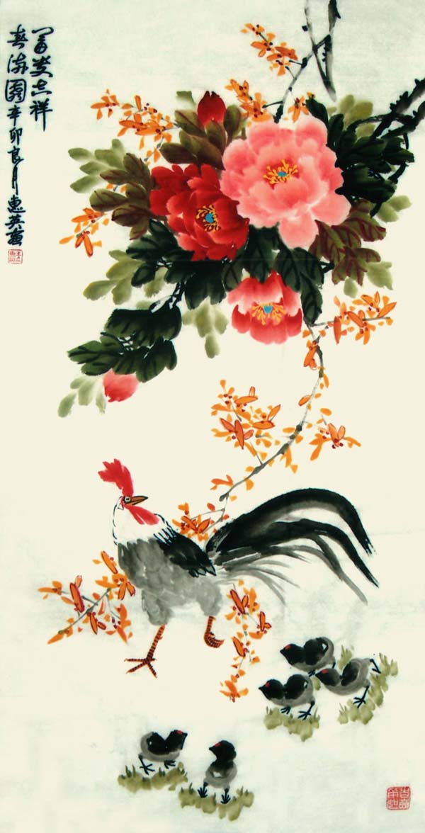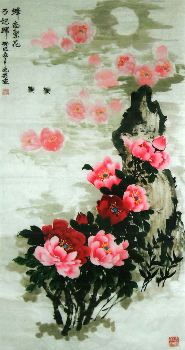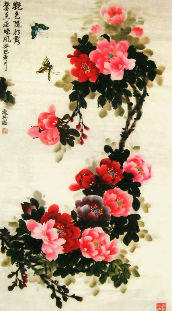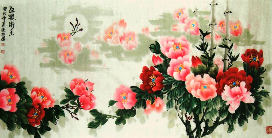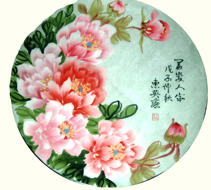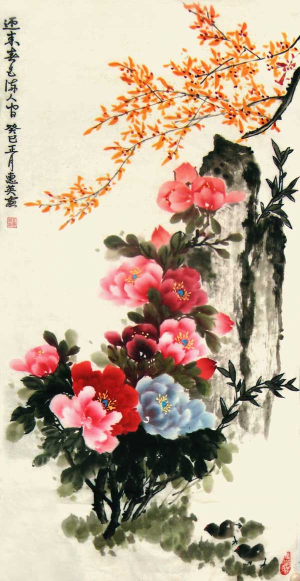 王惠英的牡丹,是在多年实践中不断揣摩和研究历代名家的画作,汲取了名家的画艺精髓,形成了自己的创作理念和独特风格。牡丹花蕊生动逼真,鲜活丰满,笔触潇洒流畅而又不失细腻,色彩绚丽、寓意祥瑞,具有圆润典丽,雅俗共赏的风格。