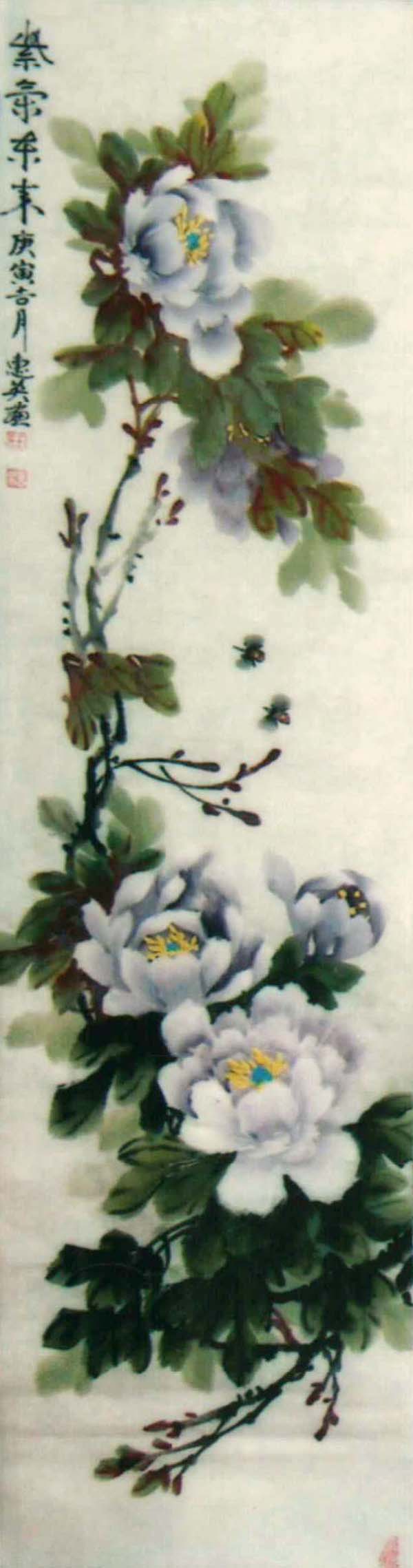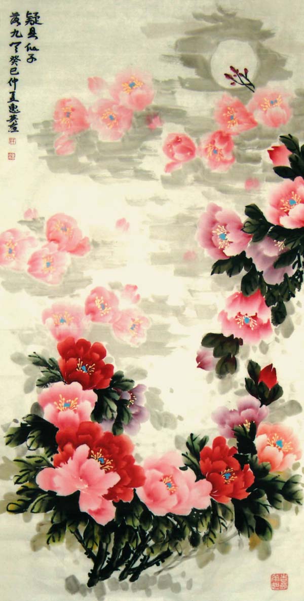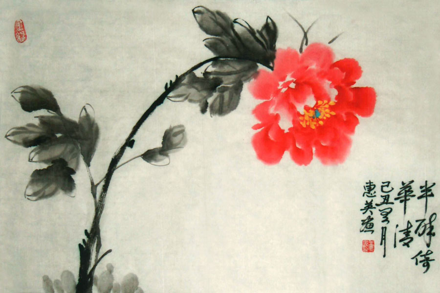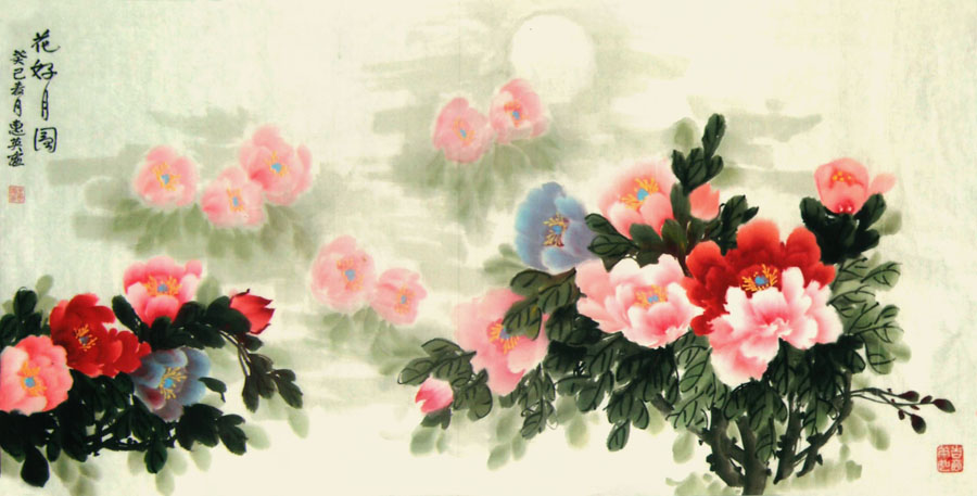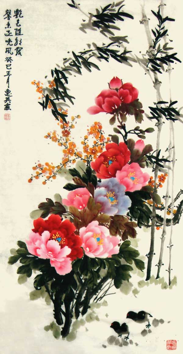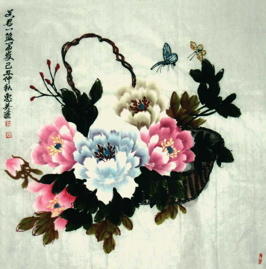 王惠英的牡丹,是在多年实践中不断揣摩和研究历代名家的画作,汲取了名家的画艺精髓,形成了自己的创作理念和独特风格。牡丹花蕊生动逼真,鲜活丰满,笔触潇洒流畅而又不失细腻,色彩绚丽、寓意祥瑞,具有圆润典丽,雅俗共赏的风格。