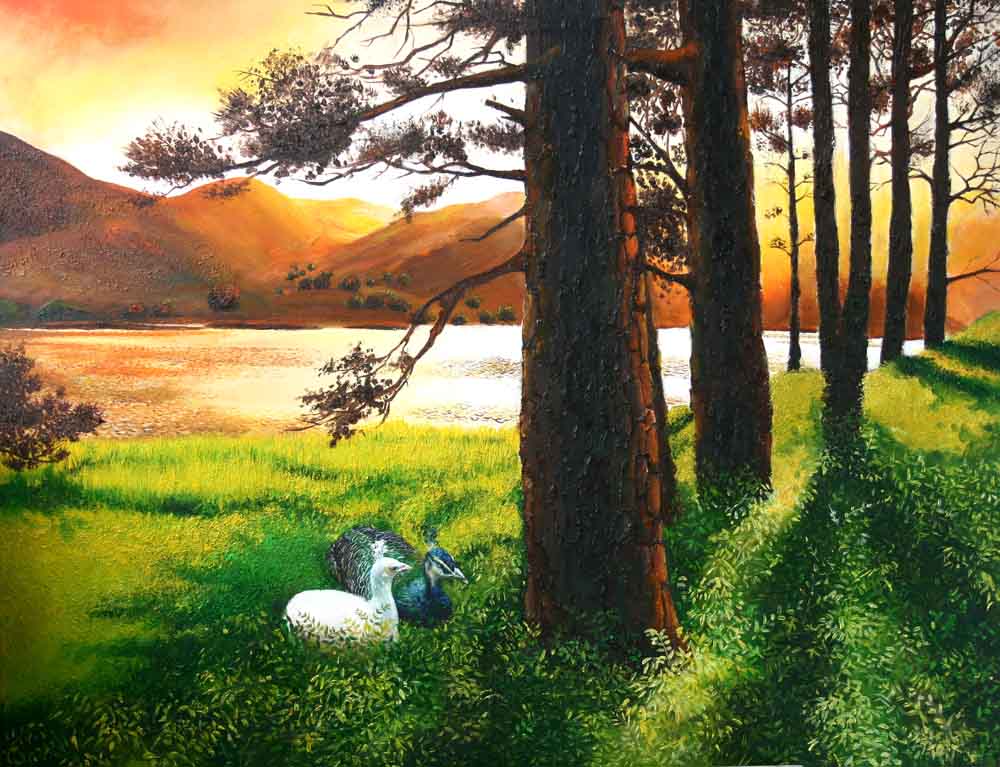 在油画的创作中,我触摸到了大自然最真实最美丽的一面,也感受到了生活之美。我用超细腻的手法表达大自然的感情,也用中西合并的手法用西画画出中国味道。不仅要画出中国画的神韵,更要把这种神韵体现得精致精美。我的画诠释着一种对自然、生活热爱赞美之情,创作出优美的画卷就是我快乐的源泉。