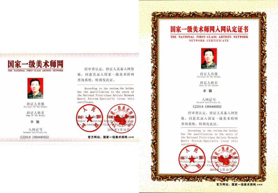 李颖,男。汉族,1940年9月生人,公务员,6岁受祖父李贡田(书法家)指导书画入门。初临二王、欧、苏、颜碑帖,兼攻西画。发表论文20篇,两篇获特奖。现为画圣吴道子艺术馆馆员顾问,现代书画院名誉院长,中国武陵书画家协会副主席、中日文化艺术院荣誉教授,中华人民共和国日史书画院理事,北京国艺粹宝书画院名誉院长,中国(北京)书画名家研究会专职副会长,颜真卿书画院名誉院长,国家级书法家等。全国诗书画大赛多次获金奖等。