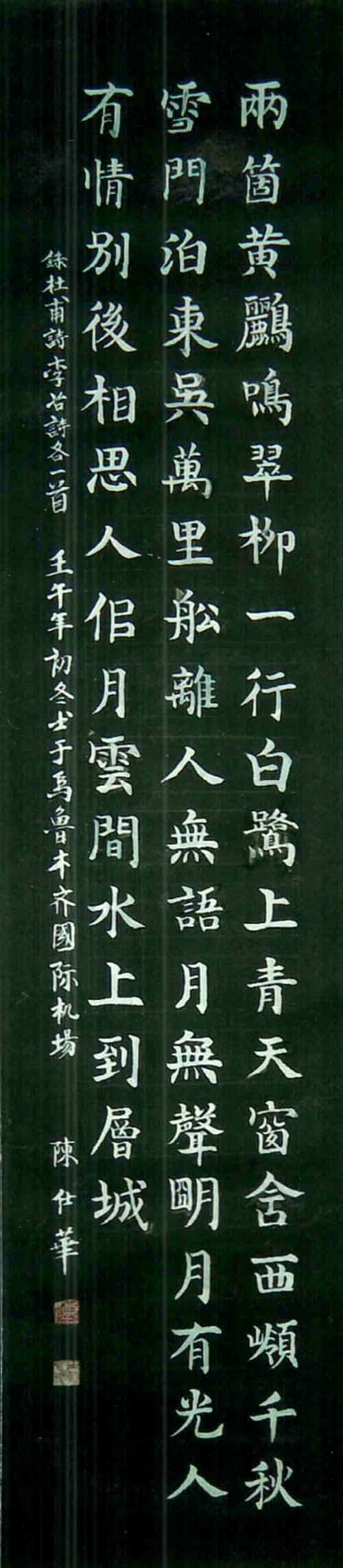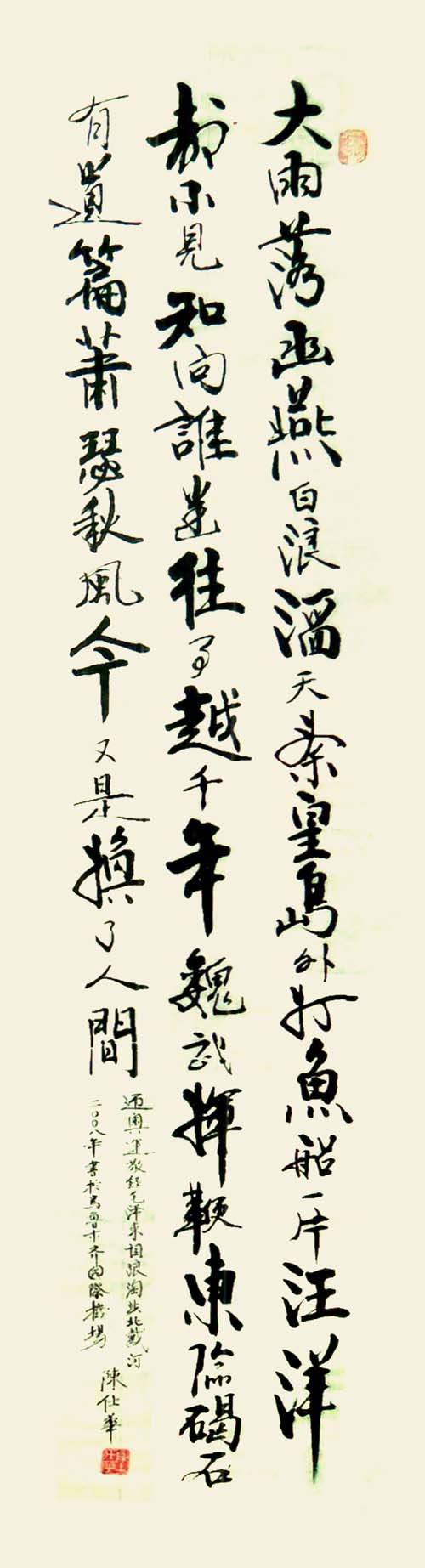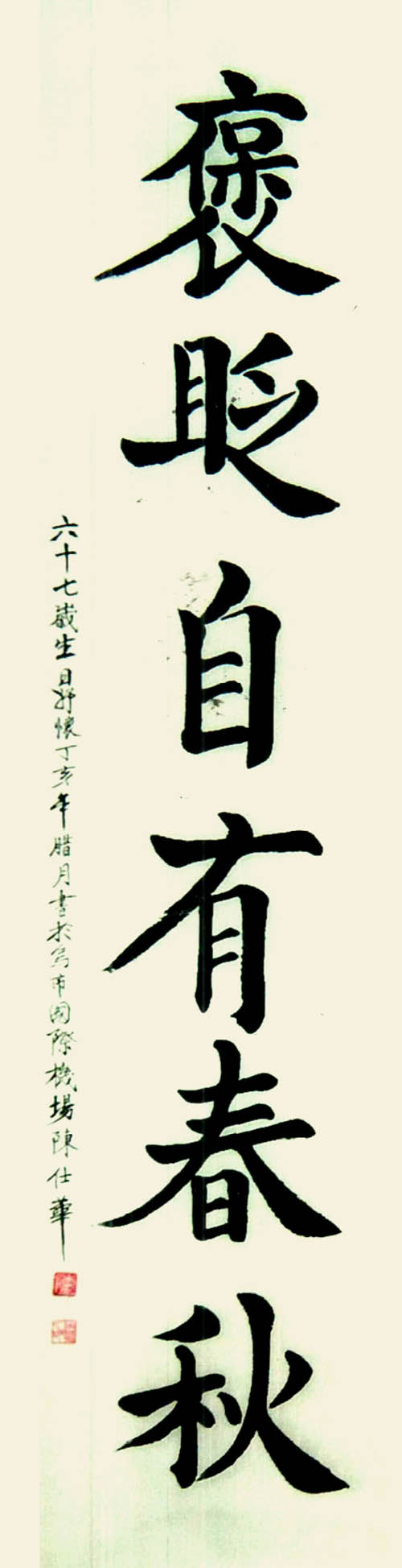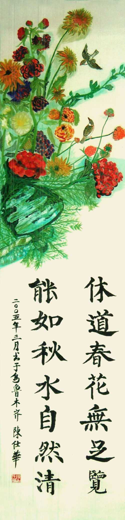 陈仕华,笔名小松,1941年生。原民航乌鲁木齐管理局高级审计师。现南航新疆分公司退休员工。一直喜爱书法绘画。1998年就参加新疆自治区老干部书画学会。参加老年大学学习书法、绘画5年多。中央电视台开通书画频道以来,书画专家的授课几乎都收看了,并进行了课后练习。作品多次获金奖,在新疆自治和南航系统参赛多次并收编到文集里。