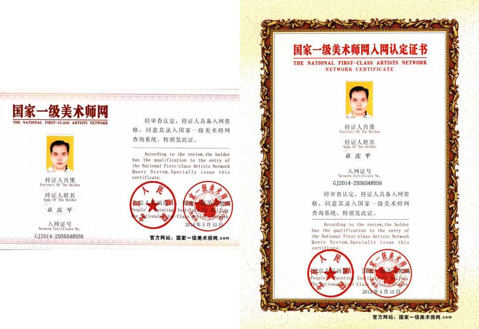 荣誉:获海峡两岸书画艺术交流《荣誉金奖》、获“清风杯”海内外书画艺术大展赛《荣誉银奖》,获庆祝建国45周年海内外书画艺术大赛(国际展)银奖;获全国教科文委二等奖……在国内外报刊杂志上多次发表,远播日本、泰国、澳大利亚、香港、等四十多个国家与地区。广东省电视台、电台均专题报道和映播。作品及传略被编入《世界华人书画家作品选集》、《世界名人录》、《国际现代书画名家教授大辞典》、《世界传世名画书法鉴赏》等六十多部大型辞书,曾任广东揭阳市区物业开发公司省工艺美术师。现为中国艺术研究院创作研究员;中国现代民族书画艺术家协会副主席;中华名人书画院院士;天香画院名誉院长;中国书画家协会理事;书画家全国联谊会理事;中国国际交流出版社特约顾问编委;《中国传统中堂集锦大辞典》顾问;香港美术出版社特约编委;广东省书法家协会会员;广东省工艺美术家协会会员;世界书画家协会组织部领导;上海民族画院院士;北方书画艺术院教授;中国江都画院高级画师;国家人事部人才所书画研究中心研究员;中国现代书画艺术名人研究院院士;中国豫苑画院导师研究员;中原书画院客座教授;爱华路多国际书画艺术函授学院客座教授;国际美术家联合会理事;中韩文化艺术专家委员会委员、世界文化艺术中心研究员、世界文化艺术出版社名誉主席、世界艺术家协会理事、跨世纪中外书画艺术名人证书、国际金奖艺术家;等十多个艺术院校顾问教授等职称。