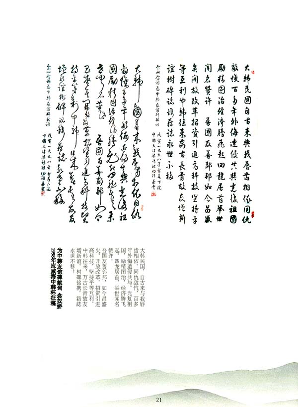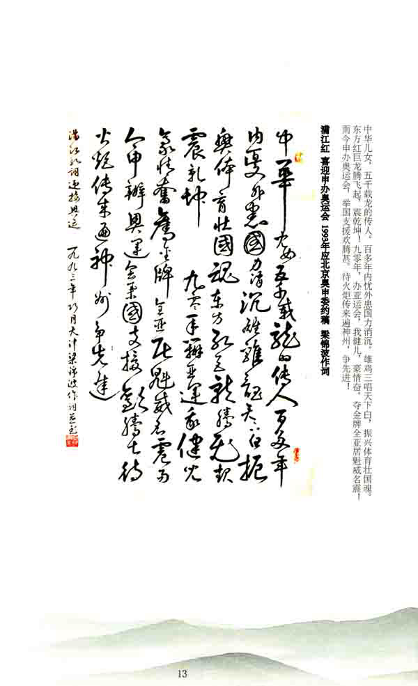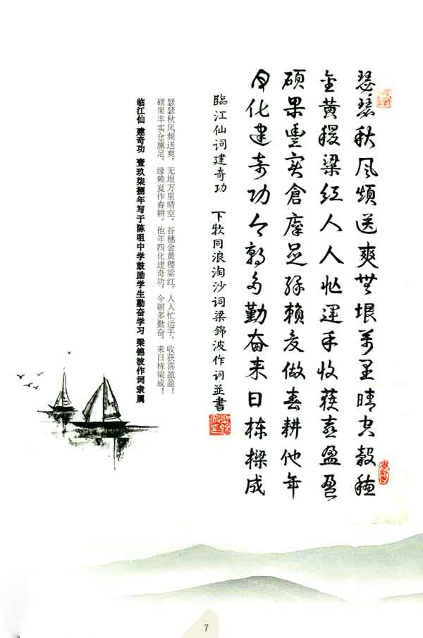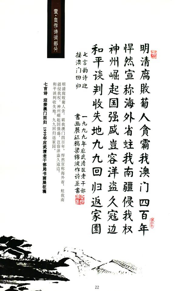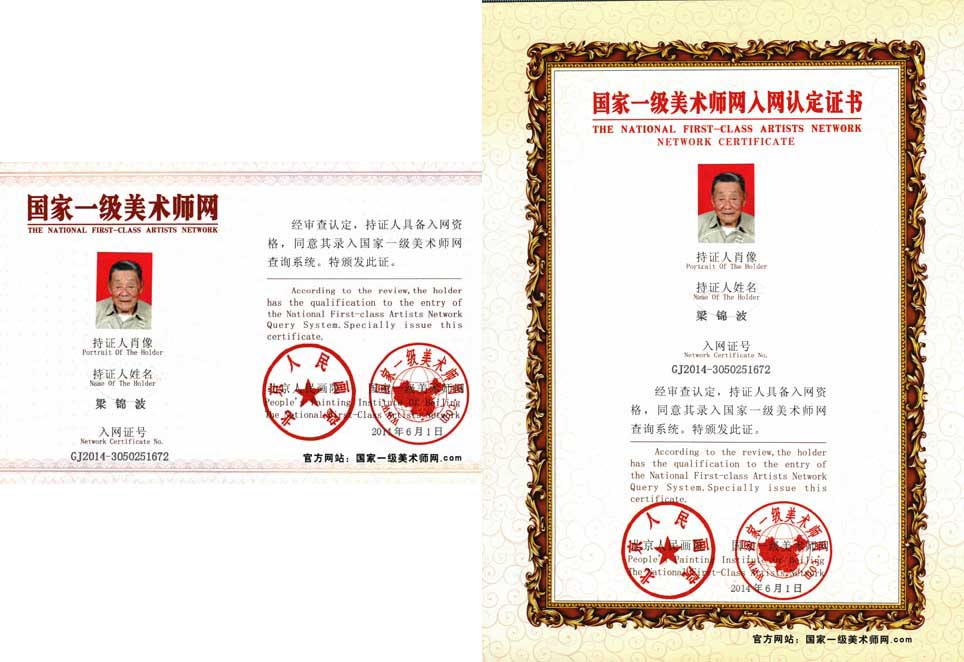 梁锦波,男,笔名:墨洲散人,1926年4月生于天津市武清区陈咀镇中学离休教师。自幼酷爱书法与诗词。离休后,分别在无锡书法艺专和郑州书函院进修四年。作品曾多次在国内外参赛并获奖。87、90、91、93年,分别获长沙、黄州、郑州、美国、广安等地的一等、一等、二等、一等、特等奖。92、93、95、96年,分别获阜阳、北京、关东、南京等地的书法收藏证书。94年获北京《世界书画篆刻家通联大全》。95年获加拿大温哥华世书协的《当代书画艺术名人证书》与《世界书画家经典》。98年获北京的《二十世纪文化大系》,都收录了我的作品。2005年,武清老干部书画集,收录了我的四幅作品。天津市和武清区老干部局,从1999年至2010年,这12年,每年都举办书画展,我都参展,每年获得双份的荣誉证书共24份与奖品。2006年,获山东潍坊国际艺术碑林的荣誉证书和拓片,在泰斗碑的喜报中,把我与王羲之、颜真卿、柳公权、郑板桥、张大千、于佑任等历任书画泰斗齐名。2009年,北京文化部艺术服务中心将我的《祖国颂》其一、其二的作品收录在《大型艺术文物史志重点收录》中,并授予本书编委的荣誉。2010年五一节,我被邀请参加北京人民大会堂英模人物座谈会,获得奖旗、奖牌、中华印、合影照、录音带等奖品。2011年,我的作品《长征诗》收录在《新中国书画六十年》中,2012年,我获得山东巨野寄来的《特邀证书》和《获奖证书》。荣获《终身成就奖》和《飞天奖杰出贡献人物》等荣誉。我现为北京、无锡、阜阳、临沂、济宁、海丰、桂林、长沙、广安、大运河书画院等地的书协会员或理事。