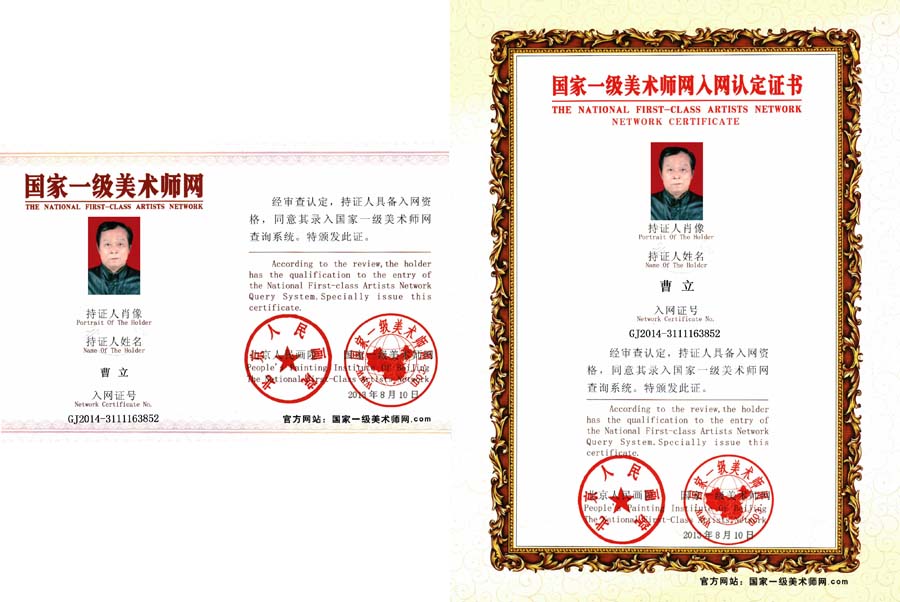 曹立,字建树,男,生于1941年4月,籍贯:江津,学历:大专。江津区中学退休教师,从小热爱书画。近些年活跃艺坛,书风自成一格,在国际国内曾多次荣获金奖,作品被收编、收藏、珍藏等。2000年被授予跨世纪翰墨人才称号;2004年香港海内外著名书画家精品展精奖,并授予东方杰出艺术家荣誉称号;2008年上海艺术世博会被授予中国著名书画家称号,作品被珍藏;2012年韩国艺术世博会授予中国当代书画名家称号。曾多次参加过国家级书画拍卖会,经国际ISC艺术中心鉴定,作品可进入市场等。