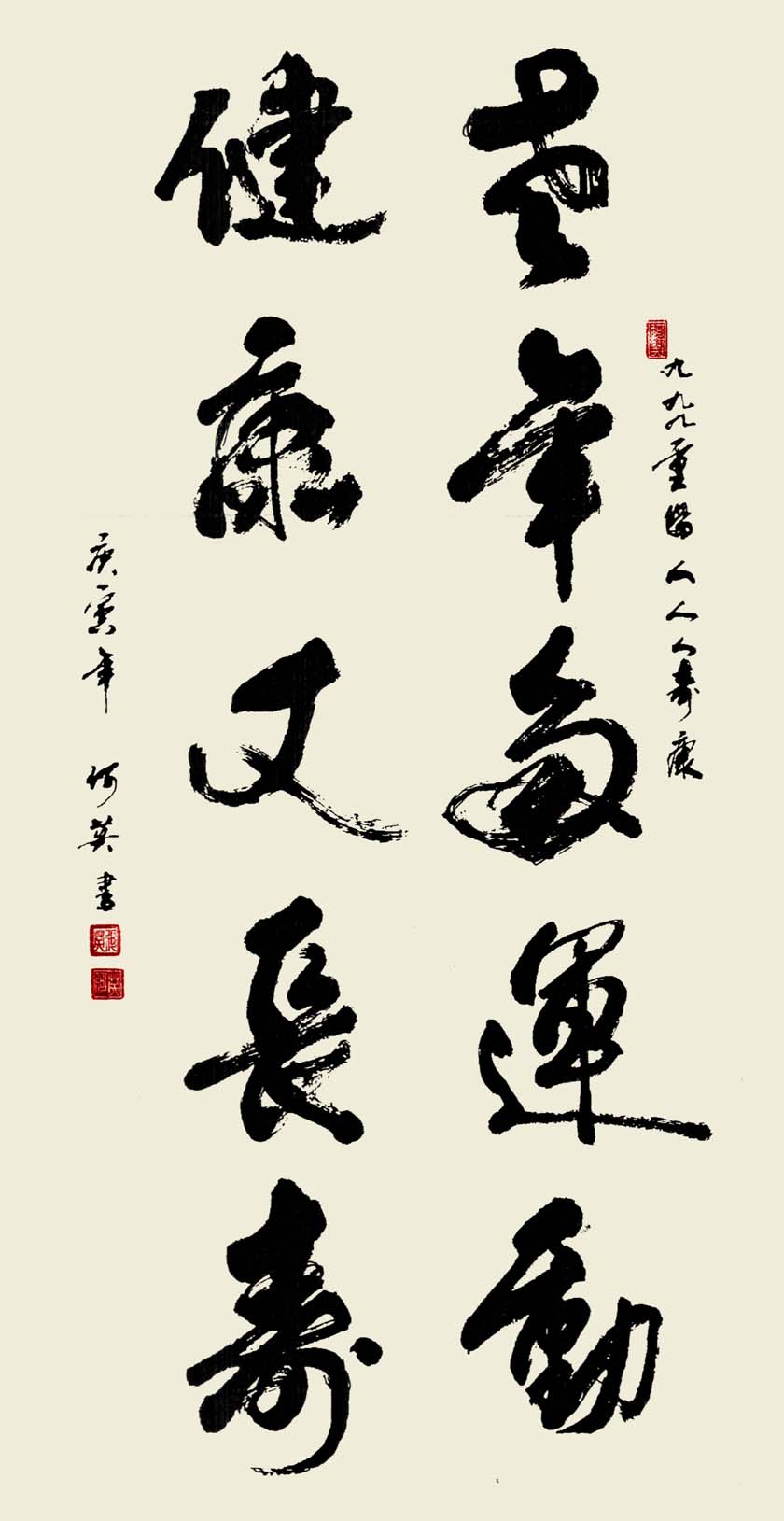 何英,男,汉,生于1946年,陕西凤翔人,原中铁电化局安监干部,现已退休,当过农工兵,自幼喜欢写毛笔字,在部队和地方常利用作业余时间练习写作,并编写对联和作一些诗歌,帮单位稿一些业余宣传,1983年至今,每年春节前上凤翔县城和周边几个县市写春联,编写的春联和书法得到爱好者和购买者的赞扬和认可。擅长行书、行草,我的目标是学习万人字的精华,写出自己的风格。作品要通俗易懂,大众化,人人都能认识,不但整体效果要好,每一个大小字都要好看。
