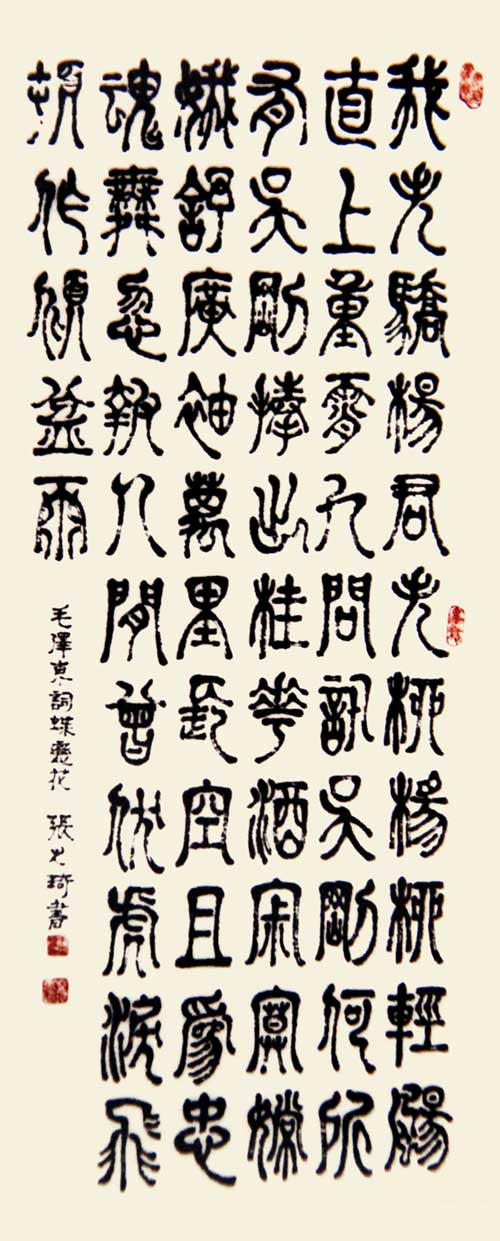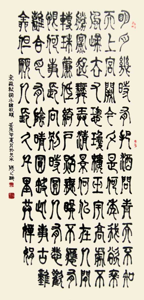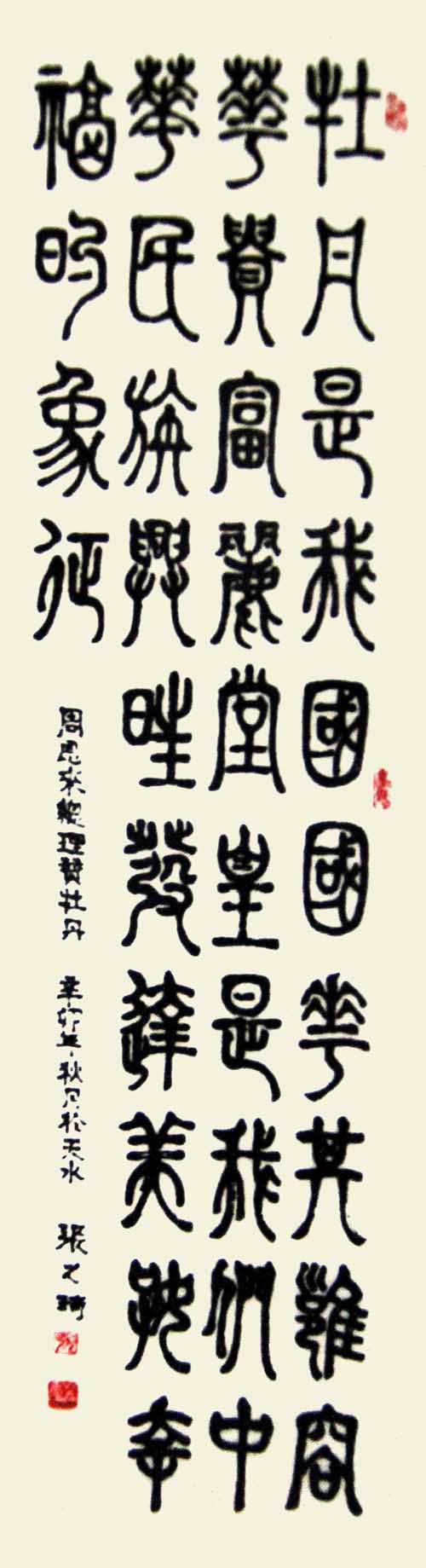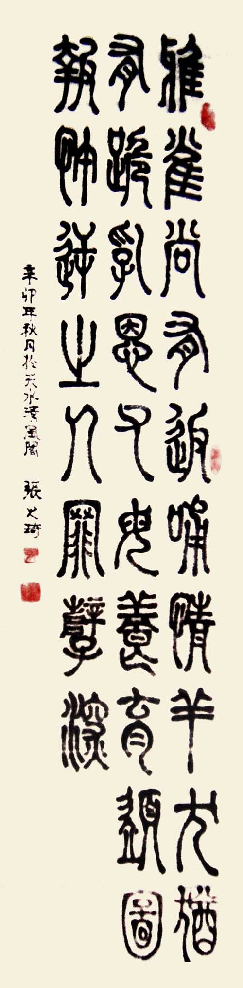 张之琦,1937年生于甘肃成县。1962年毕业于西北师院中文系。先后工作于国防大学、天水军分区、天水市第五中学、中共天水市秦州区委。酷爱书法艺术,经20年艰苦学练不辍,2010年以来,以小篆体参加全国诗书画联大展赛60余次,荣获金奖47次,银奖4次。作品入编历次大展赛作品集及《时代群英》、《东方之冠》、《联墨.丹青》、《中国唐诗书法大典》、《中国宋词书法大典》、《中华国粹百家》、《当代兰亭雅集》、《中华国粹年鉴》、《国际诗书画交流大展》、《海峡两岸大中华美术集成》、《中国古今龙字书法大字典》,以及梅、竹、牡、荷、山水书法宝典70余部。