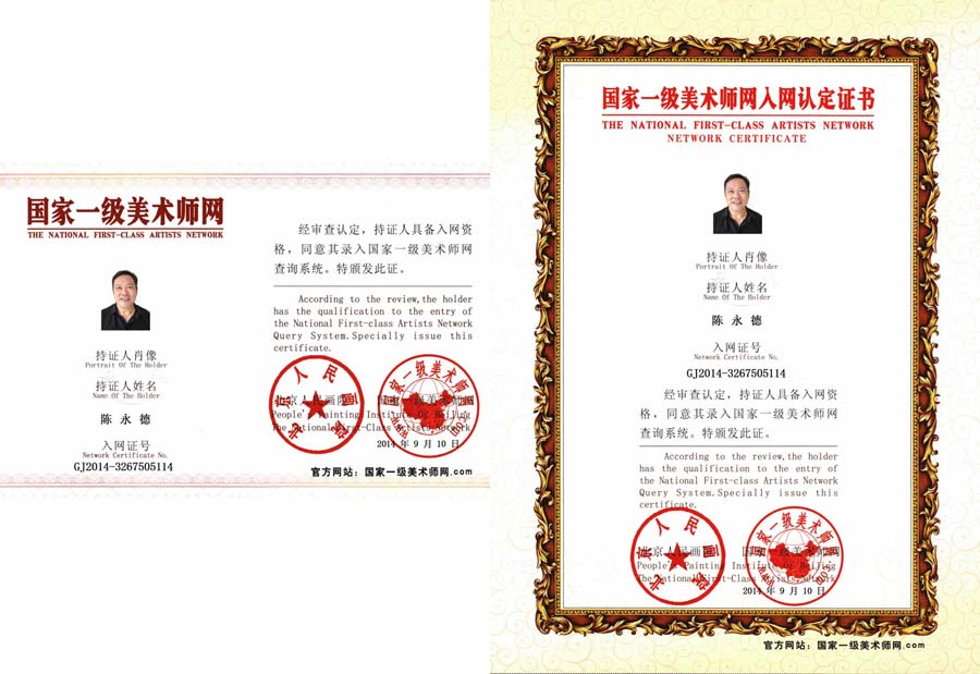 陈永德,男,字智仁,笔名梦笔,别名梁祥德,1952年1月18日出生,汉族,高中文化,浙江省温州市苍南县灵溪镇人。世袭玄风,因职业所需而薰陶于老辈们的古文,并喜作诗文与绘画。三十八岁曾临平阳县拜师学艺,得到张鹏翼老先生(原平阳县文化馆退休干部)口授身传,由于刻苦练习,书画艺术进步很快。再加勤学钻研历代名画、名帖,深受启发。近年来多次寄诗、书、画到北京有关书画社,并多次获奖。如全国楹联奖、毛泽东诞辰110周年、孙中山诞辰140周年书画奖。2009年2月被“中国书法国画研究会”授予“中国书画导师”称号;2013年2月被“艺术人物杂志社”聘为“杂志社荣誉社长兼创作委员”。2014年2月被“中国艺术人才协会”授予“中国书画一级艺术家”荣誉称号,并被增补为“中国人才协会第三届副主席。