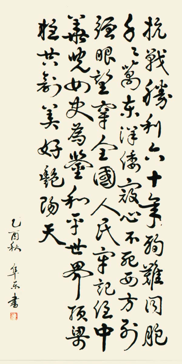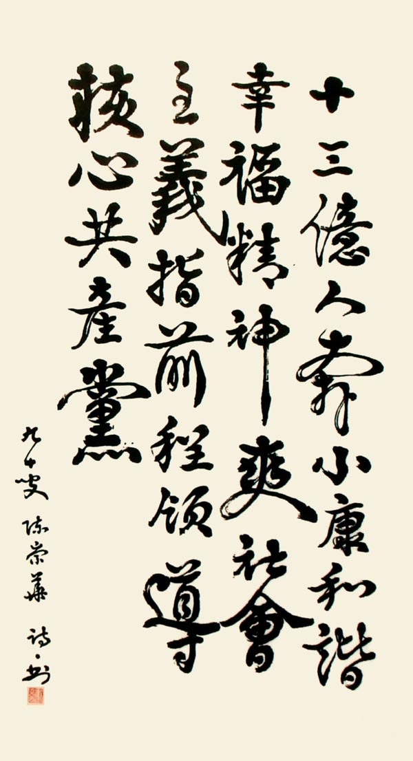 陈崇华,号阜东,男,汉族,四川乐至人,1925年1月生。大学文化,中学高级教师。1987年退休后常出外旅游。祖国广阔壮丽的山河,勤劳英勇的各族人民,深深感动着我。让我拿起我的拙笔。抒写了“十三亿人奔小康”、“五十六朵民族花”、“神州大地六十年”、“三峡大坝全球雄”等多首小诗。后来这些小诗我又大都写成了书法。