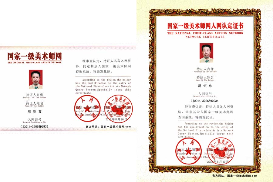 周钜尊,男,1939年生,浙江省江山市人。笔名耕新、奕然。现为中国书法美术家协会理事长;南京市长江书画艺术研究院名誉院长;黄庭坚书法艺术学会艺术顾问;北京九州艺术与投资杂志社高级书画师。荣获世界文化艺术鉴定中心授予“中华民族杰出书画家”称号。