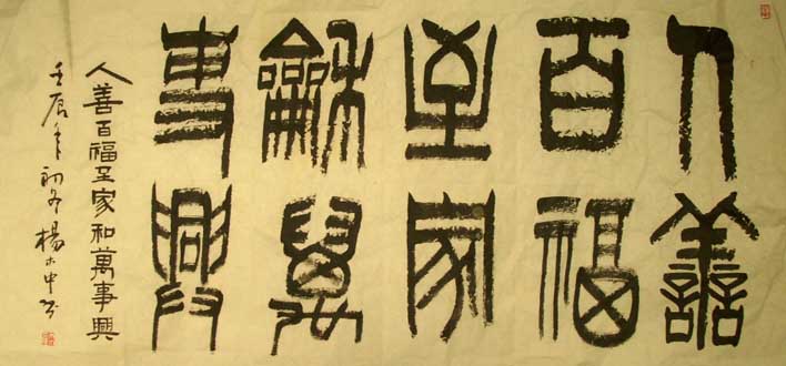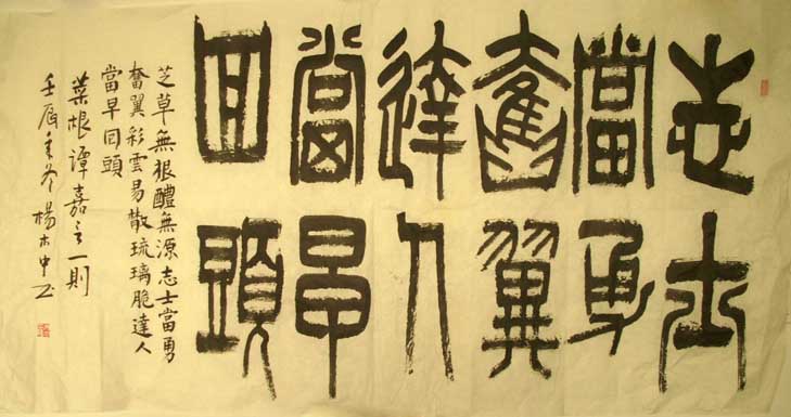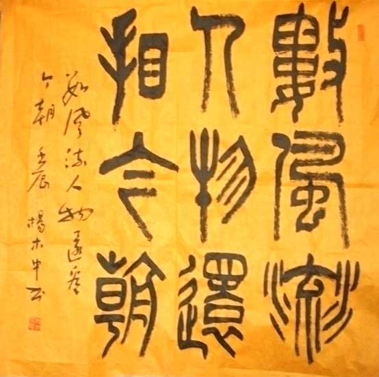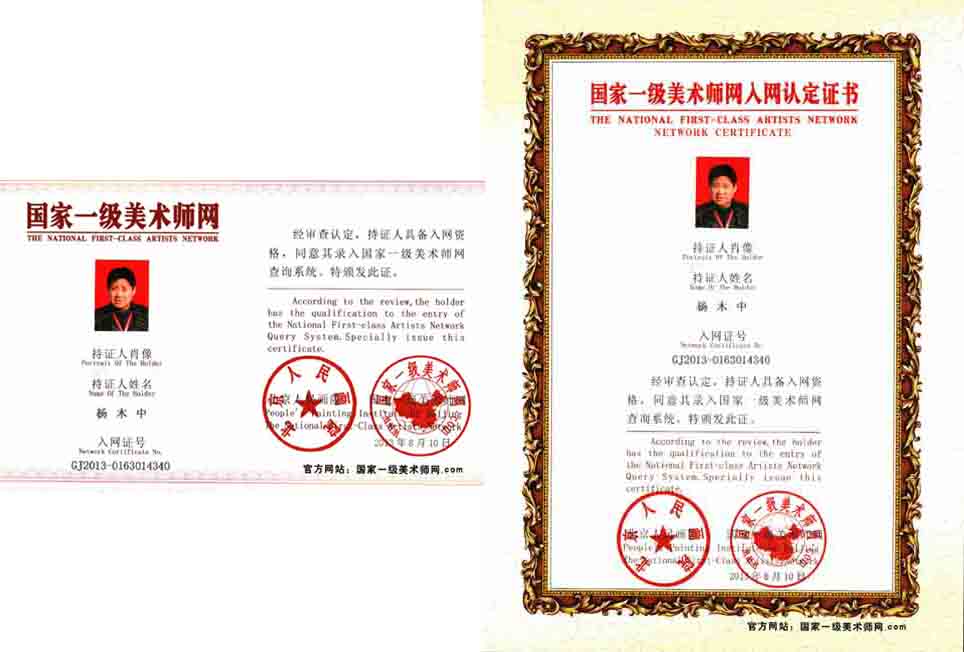 杨木中(杨木忠),又名扬柳,字“庸中”,52岁,大专文化,河北满城人,1980年始学书法。曾临摹《九成宫》、《石门颂》、《?宝子碑》等。1986年起,作品先后在国内外大展赛中获金奖、一等奖30余次,其它等级奖80余次;入选《中国十大书法家》、《影响中国100位艺术大家》、《推动中国书画艺术发展三十位卓越人物》、《新中国国礼艺术大师》等大典100余部;在书报杂志刊登300余幅;出版《杨木中书法集》自创拼篆篆意书法获国家版权认证;在国外展出50幅(次),被国内知名及友好人士收藏3000余幅。为北京亚运会、奥运会、汶川地震赈灾等大型活动捐赠书法作品30余幅。曾荣获“1998全国百杰书法家”,2006—2007年、2008—2009年、2009—2010年中国书法百杰,2007、2008年中国艺术年度人物,百名中华文艺复兴贡献人物,共和国杰出艺术家,曾被授予“中国当代艺术大师”世界艺术大师等称号。现为河北书协会会员、中国名家书画院一级书法师,中国书法美术家协会、中国艺术家交流协会、世界华人书法家协会名誉主席、中国文化艺术学会名誉会长、中国当代艺术协会主席、中国诗书画出版社社长。