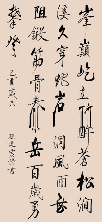 孙建震,字雨震,男,1937年生,山东肥城人,中共党员。1964年毕业于曲阜师范学院中文系,先后曾任临沂地委、肥城汶阳党委、县委秘书;后任东营市市府办秘书、科长、史志办副主任;胜利油田档案处主任工程师。自二十世纪七十年代,曾先后在大众日报、光明日报、新华社、山东出版社发表几十篇新闻通讯稿件,主编过《黄河三角州新貌》,参与、组织、主持、编纂了《山东省志、石油工业志》。自幼习书,工作中经常练习书法;退休后,参加全国书画大赛,有280余幅自撰诗词、楹联、书作分获金、银、铜奖,被收编于全国出版的《艺术家词典》、《艺术家收藏大典》、《书法艺术鉴赏》、《书法家博览》和纪念伟人毛泽东、周恩来、邓小平及古代名人王羲之、吴道子、欧阳询、苏东坡、岳飞、纪晓岚等近百部书画名著中。因其阅历丰富,文笔精当,诗书兼备,字体秀美传神,先后被中国民族书画院、中国国学研究会、中国书画艺术家协会、中国收藏艺术研究会、中国民族文化研究会、中国文艺家创作协会授予“当代翰墨艺术家”、“中国书画名家”、“当代杰出文人书法家”、“当代中国书画收藏市场最具收藏价值艺术家”、“人民艺术功臣”、“当代中华文化名家”、“国际最具影响力艺术大师”等荣誉称号。还被多家院会诚聘为院士、研究员、客座教授、名誉院长、主席、馆长等职。