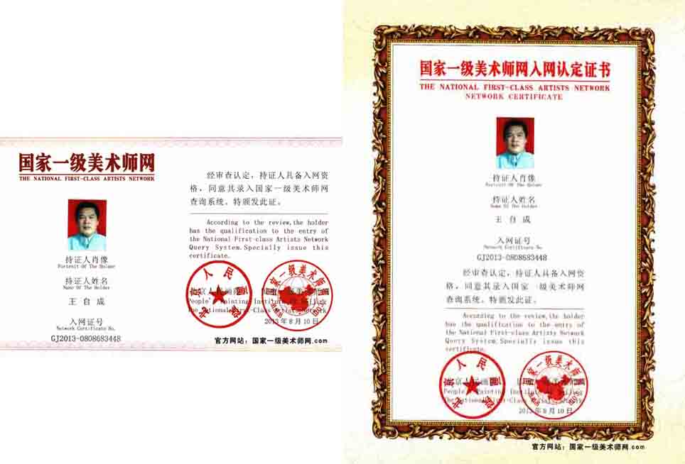 王自成,泰山汶阳灵湖居士,泼墨道人王自成,1943年生,自幼喜爱书画。16岁参军在青岛北海舰队军人俱乐部美术讲座班学习,后进修于东方美术电视函授学院装潢系。师从廖乐平、王立志、高泉、魏启后等。国家美术家联合会会员,中国书法家协会会员,中国美术家协会会员,中国国画家协会理事,中国书画家协会书法师,中国硬笔书法家协会、世界硬笔书法家协会会员,颜真卿书画院名誉院长,东方美术研究院教授,中国艺术学院国画系教授,中国艺术鉴定委员会书画学部委员,中国艺术网副主席等。曾赴韩国进行文化交流,获“当代中华文化名家”、“终身成就艺术家”、“高级书画家”称号。入书入典几十部,展示于中国美术馆、中国革命历史博物馆、中国军事博物馆、全国政协礼堂、中国文学馆、劳动人民文化宫等。被文化部、少林寺、颖州西湖碑林和海外诸多国家收藏。发表于《人民海军报》、《前线民兵》、《中国矿业报》、《中国书画家》等报刊杂志。