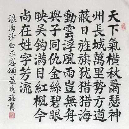 酷爱书法,孜孜以求,唐楷入手,取其气韵自然,雄浑壮美,广采名家之长,临池不辍,喜伟人毛泽东书法,潜心研习“毛”体书法多年,较多作品发表。