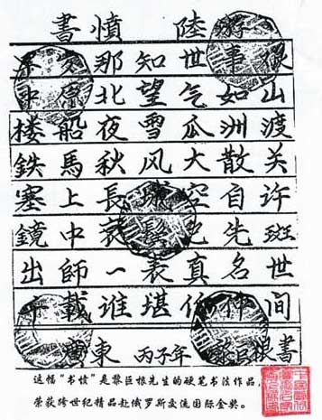 荣获华人硬笔书法中国艺术展特别奖;建国45周年海内外书画大赛国际银奖;97香港回归中国书画大展国际银奖;跨世纪精品赴俄罗斯交流暨硬笔书法“书愤”获国际金奖;北京东方神州书画院《二千年中国艺术家》艺术历史长卷特邀金杯奖;共和国50年人民书画艺术家银质勋章奖;被中国新闻文化促进会授予“中国时代新闻人物”,被中国近现代史史料学会授予“中国时代英模”。被中国艺术名家协会研究院授予“艺坛名师”。中华名人杰出成就金奖,2010年5月荣获首届中国文化“华圣奖”最高荣誉金奖,被中国民族艺术家协会授予“东方文艺典基人”2010年8月荣获国际奥林匹克书画艺术百杰功勋奖。2011年4月荣誉世界华人美术学会举办的首届华人美术奖、终身成就最高荣誉奖。其艺术成就载入大型画册《世界华人美术名家大典》(珍藏卷)。2012年10月被香港特别行政区书画社授予“中华爱国英才”荣誉称号,2012年11月被中国书画名家研究会授予“2013年中国艺术大师”称号,被中国名家书画院授予“中国当代艺术名家”;2013年8月被北京人民画院授予“国家一级美术师”的称号。并获得了“世界二十世纪成功人士”千年之交荣誉金质勋章。
