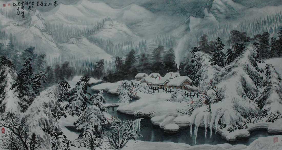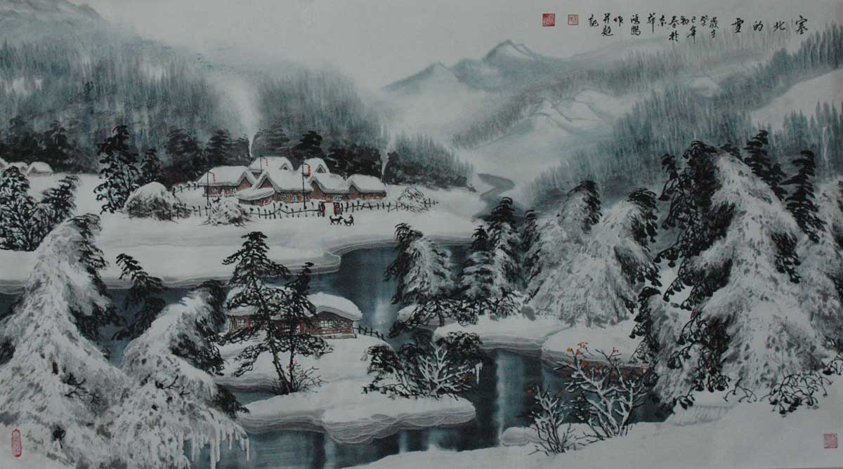 冰雪山水画家吴鸿鹏(右)和恩师于志学其主要作品《塞外风光》春夏秋冬150米长卷和《关东雪韵》100米长卷恩师于志学题跋,《塞外风光》被友人收藏。