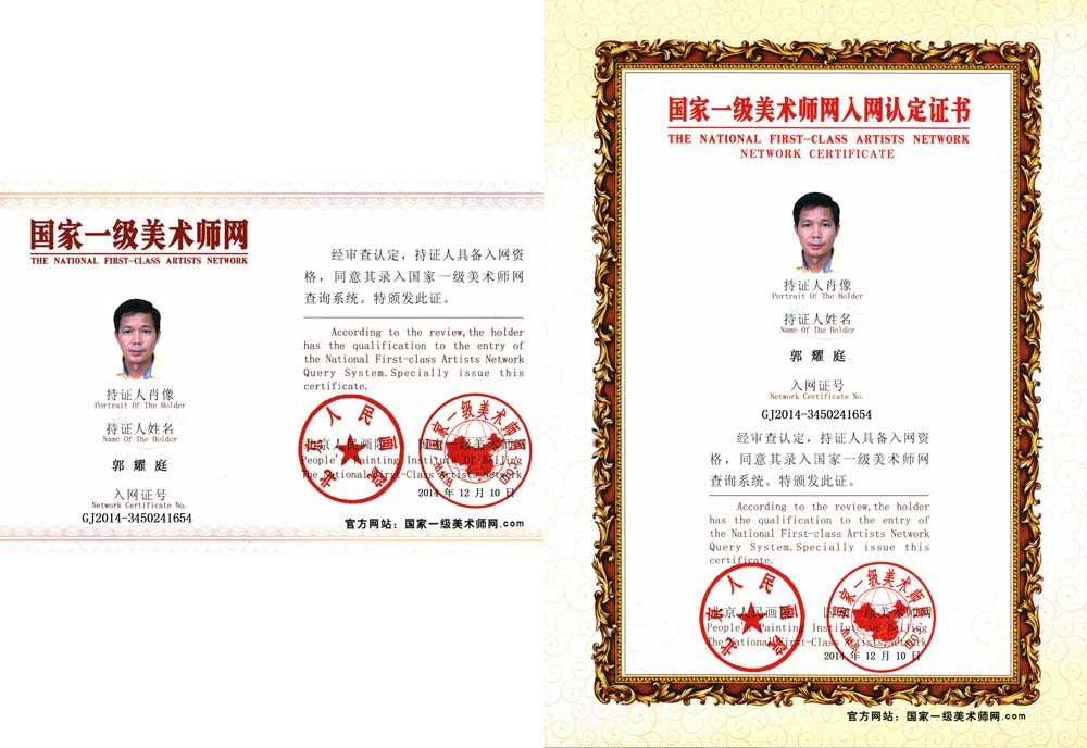 郭耀庭,男,1965年5月生,福州人。现为中国国家书画院副院长、国家一级美术师、中国传统文化交流协会常务副会长、中国文化学会艺术委员会主席;1997年被中国美术家协会授予“当代书画艺术家”荣誉称号。同年被香港科学院授予荣誉博士称号,并先后被中国国家书画院授予“爱国主义艺术家”、中国文联任命为“中华艺术形象大使”、世纪飞龙奖终身成就最高奖、中国文化学会授予“感动中国文化人物”、世界教科文卫组织授予“大不列颠百科艺术家”等荣誉称号。