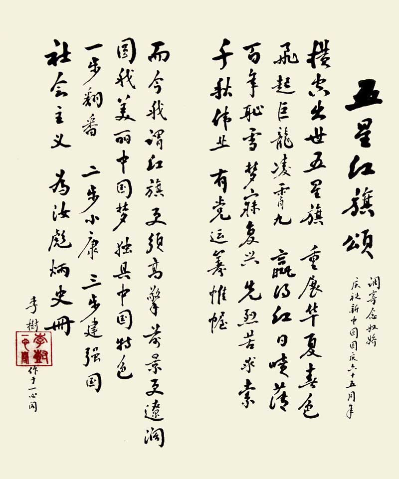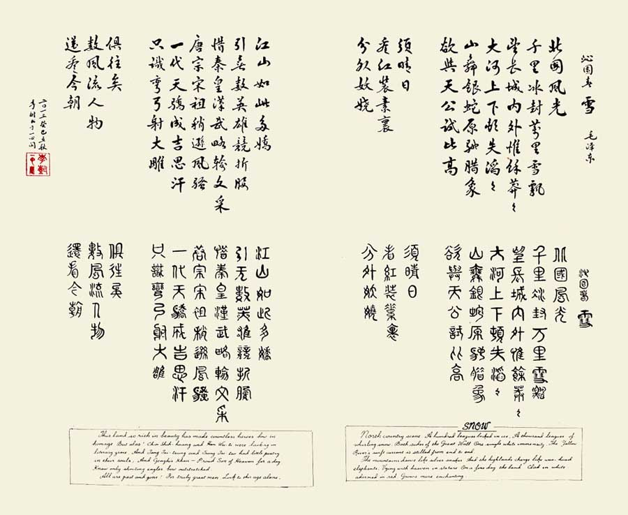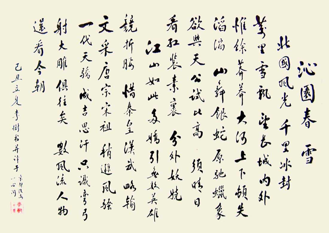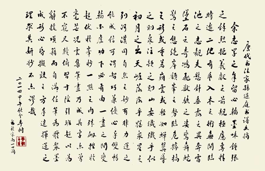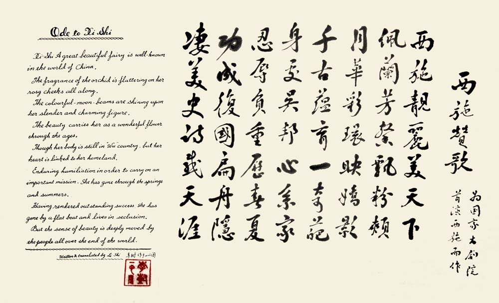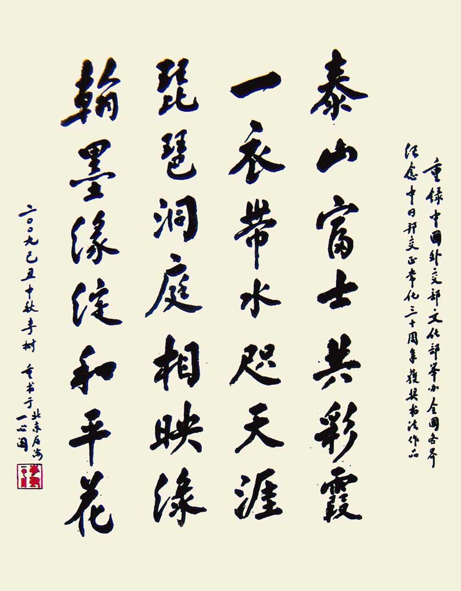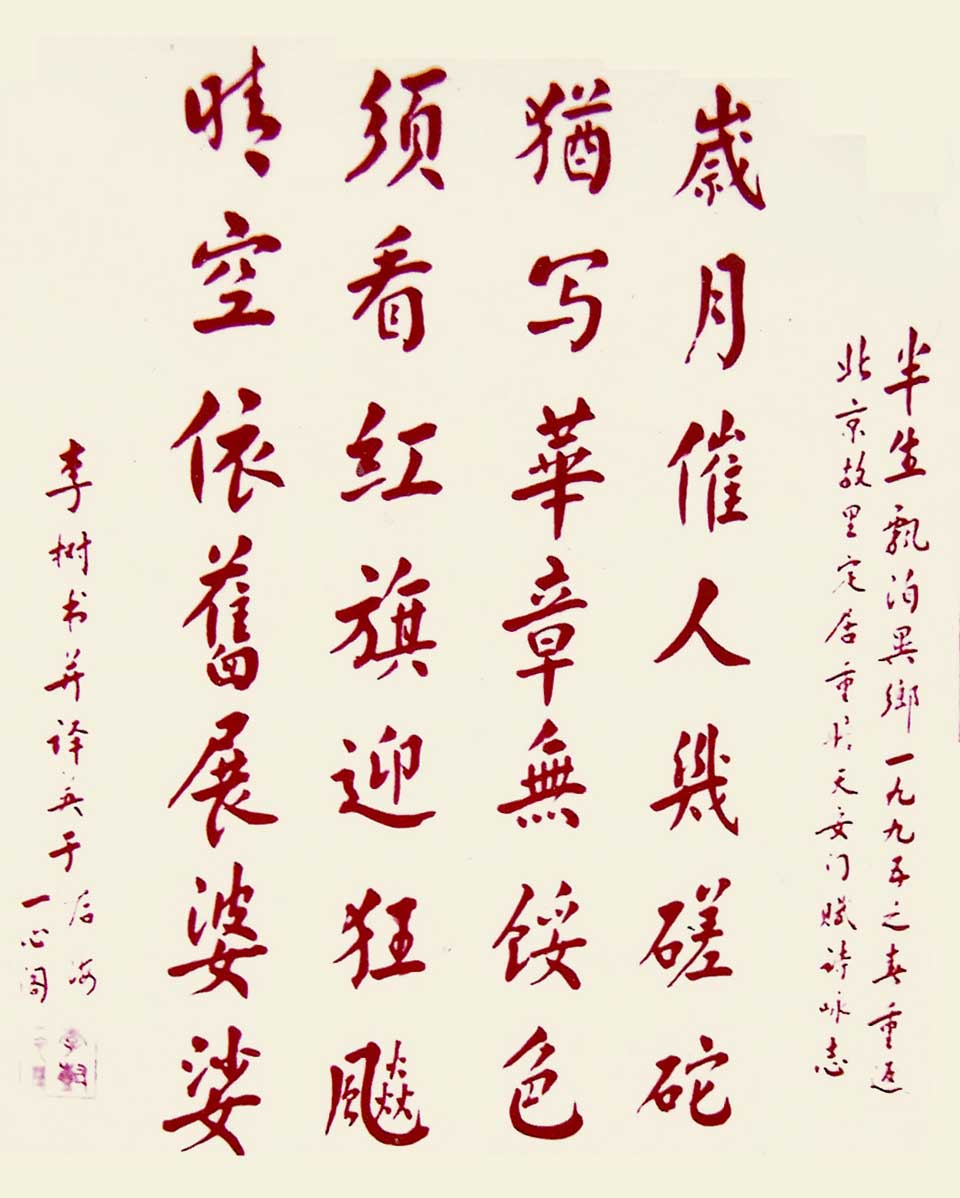 我的书法以行书为主,特点是融古汇今、发扬中华文化多方面国际交流并附英译颇受欢阅,朝阳798大院中国书法中心有作品陈列,由于历史经历的必然,我已形成了固定的思维方式即:以文会友、增进素养、不计名利、勤俭万本、健身心畅、服务社会。
