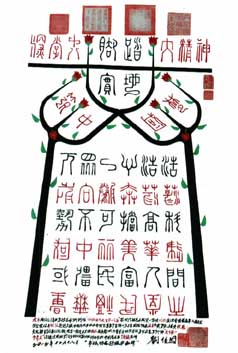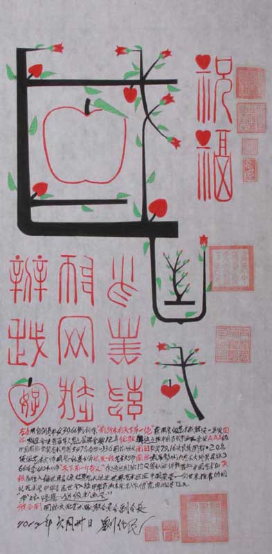刘任民,男,1932年2月生于广西桂平,广西防城港务局退休职工。小学毕业后到邻乡打长工。1952年春广西省茅桥林场工作,1953年元月出席省首届农业劳模及1957年省生物药厂两次市和一次市团员先代会。1972年7月广西防城港务局工作评优秀党员一次共获近20次表奖。2010年共和国英模,建党90周年创先争优先进个人,授最具科学发展观先进人物。获党十八大授十八大文艺代表人物称号。创发三件两次上南京晚报。1992年退休1994年春订出(13560)学书画计划,在老伴生前的鼓励是“要不跟在别人屁股后面走,要用当年搞技术革新那种精神闯自己的新路子才会有出路……”。她的话似精神原子弹,把我的思想炸开了花,因此大胆的打破千古“常规”,在没有名师指导和范本攀临的情况下,进行“寒酸瞎撞”力及的新路子,学千古以来没有过的事,自始至今用水5811斤,刻苦练书取得大突破。如两手同时书两正、两反、一正一反、左右横书(闭目能书并能两手同写一个字)、一正一篆、同写一个或两个不同字、从字下方往上及从字的四个角书等。两手均能拿2-6、7支笔书。两手交叉写字、同写一行字。十指:均能5斤笔书四个不同字即四个方向、叠成姜状轻重笔书。轻重笔“公鸡独立”能书但闭目不能书。用8-11斤笔练字。左手用多法书1555米含两手同写一个字167米奇书。学绘字中字画304幅234米图像组篆体字近万个,研写出800多种不同笔法及奇书443例、研做成各种练字点水或自来水笔44支其中两头能写字的14支。左手用水一笔写完国歌。用减笔连体书写法可把“龙虎凤”等字无休止的连书下去。经艰苦“瞎撞”至今获第七届政府奖“华文奖最佳创作奖”、“国家级成就奖一等奖”、国际友谊金奖、首届华人魁星奖金奖、2012年伦敦奥运之旅中国当代书画展金奖等549含特金—338国际性及闭目书奖79.16次。民族国粹•20名顶级艺术大师、世界一级艺术大师、国际最具影响力艺术大师等荣获371项含 42个师。作品通过国际ISQ9000A等认证,评为首批中国艺术品顶级品牌,获奖作多次上报及电视和国外巡展。入编世界名人录、国际最具影响力大师风范集、世界艺术通史、世界文艺名家大辞典、世界艺术巨匠等1170部名典。联合国际艺委会评选出2012年度最高艺术传承人物12人及中国大陆有关部委等联合推荐49人为英国皇家艺术研究院院士之一者。现是联合国国际文化艺术家联合总会副会长、英国皇家艺术研究院客座教授、环球国际艺术家协会终身副会长等49个社团组织的副职领导并获优秀领导人提名奖。六篇论文获奖。时至2013年6月北京邀请441次信电邀拍电视六次含香港一次经不许均不应邀。人们称他“书坛怪客超级书画家”等等。