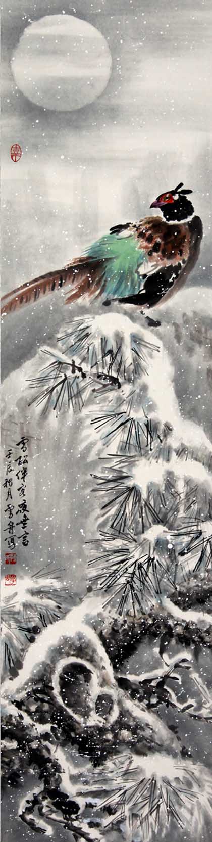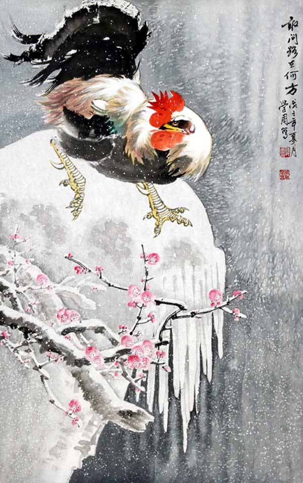 冬是萧条的,而陈学周的画都从不让人感到萧条。他总是喜欢把他的花鸟们置于冰雪严寒的静寂之中,表现它们旺盛的生命力和不屈的精神。这不,冰雪中自有腊梅,水仙散发幽香,自有红梅提早报春,自有踏雪寻梅的雄鸡攀上冰雪覆盖的山崖,仰颈高歌。这是画家高远的志趣和追求,也是在墨歌笔舞讴歌时代的精神。