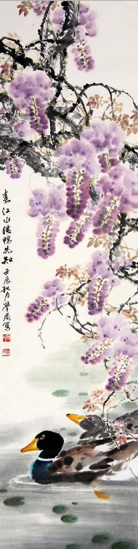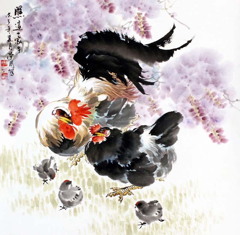 他将他笔下那些神态毕尽,情态迥异的“鸡族”安排了各种不同的角色故事,放养于更迭变化的四季之中。环境的烘托更给那些角色和故事的演绎增添了特有的魅力。在母鸡的身上永远显现的是慈爱、仁义、团结和负责的母爱情节。瞧!在春风和煦,一轮盛开着金色迎春花丛中,十几只小鸡簇拥着他们的母亲,他们亲密无间、共同觅食、嬉戏争斗、相互追逐;他们此呼彼应,相挟相携,徜徉在春天的绿色之中。牡丹盛开,紫藤翻动,七只雄鸡高蹈阔步登上高高的山石,骄傲地抖起绚丽的尾羽,一场春季选美正在这里举行。这是多么生动有趣的一幅幅场景啊!陈学周写意画作洒脱的笔墨中蕴藉了细腻、生动、传神的刻画,表现出的是春的万物复苏,是生命力跃动向上的可贵精神。