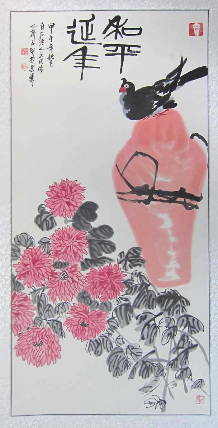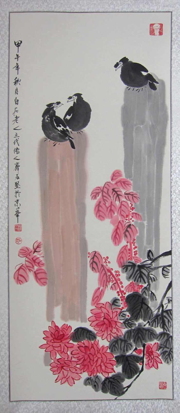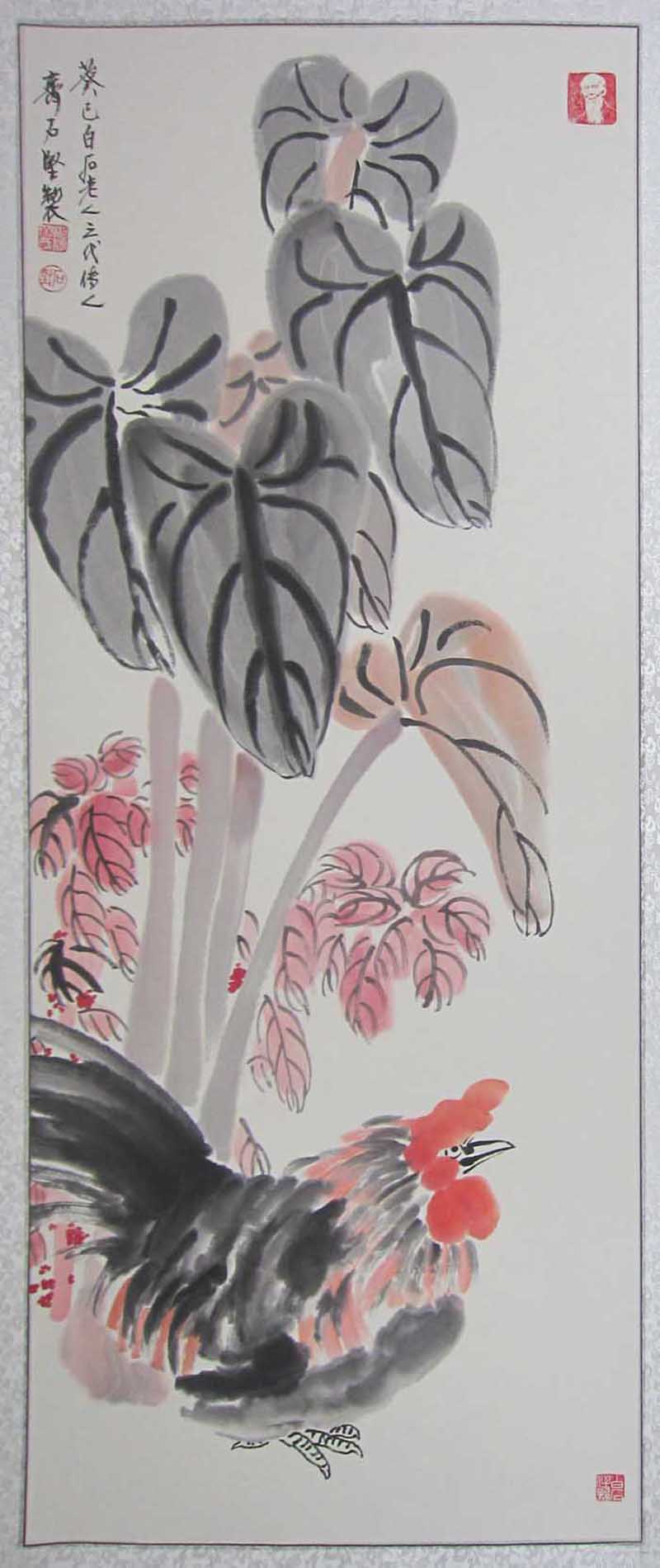 他的作品古韵犹存,从容而雅,笔墨运用深得其叔祖父白石老人的精髓,又有自己的风格,清新淡雅,颇有回归自然的朴实。时而严谨细腻,时而洒脱奔放,尤其对虾、蟹、蝉、蝶、鱼、鸟的创作表现的水墨淋漓,达到炉火纯青的地步。于心控中沥成画面,犹如交响乐章,旋律有起有落,读来令人叹为观止。
