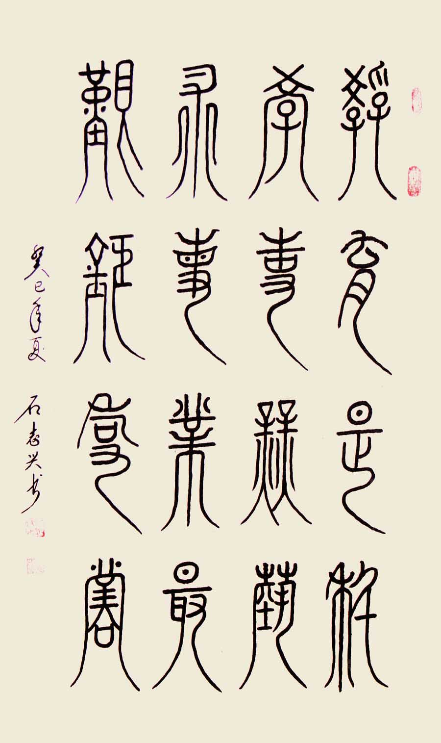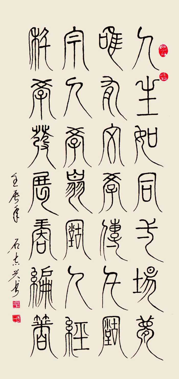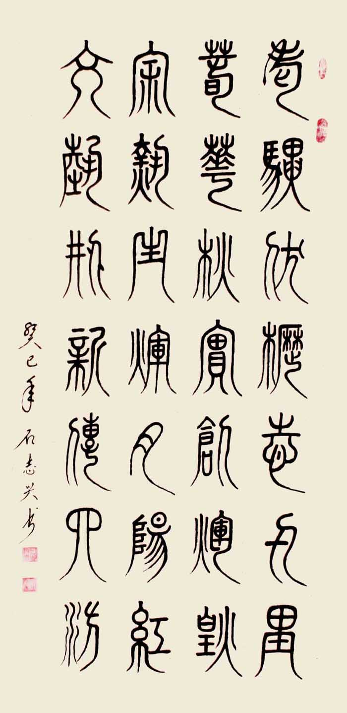 石志兴,男,汉族,1935年生。从事教育事业近四十年。山东省老干部之家书画协会会员,中国老年教育书画研究院院士,中国硬笔书画协会会员。同老伴李长芳,儿子石红旗创作了东方艺术馆、东方图书馆、长青文化馆、中华教育馆、红旗养生馆和名家文艺研究院,任院长。著有《墨宝》、《书法锦集》、《书法宝库》、《书法艺术》、《篆书毛泽东诗集》、《再谱俏夕阳》等十二部著作。曾在王羲之书画报和《老年教育•书画艺术》刊物上发表过书法9篇作品。从2012年至2015年在全国书画大赛中获一等奖、金奖和特等奖23次,发奖盘和证书。其作品已收到国家级的出版社出版的大型的作品集里。评为“繁荣社会主义文化艺术领军人物”、“建设社会主义强国的领军人物"。授予“全国诗文书画先进工作者"、“新中国新时代艺术名家’’和“中外当代文学艺术家百杰人物”等荣誉称号。其名已入编《中国文化传承功勋人物志》、《中国诗文书画家人物大典》和《当代中国文艺家大辞典》。“中国当代名人文化研究会”和“中国传统文化研究和发展促进会”授予“2015全国典型先进模范十佳人物"。国家文化部和人民日报社授予“全国老师代表”荣誉称号,并发毛泽东龙纽玉玺,作为“名家文艺研究院的镇院之宝"。
