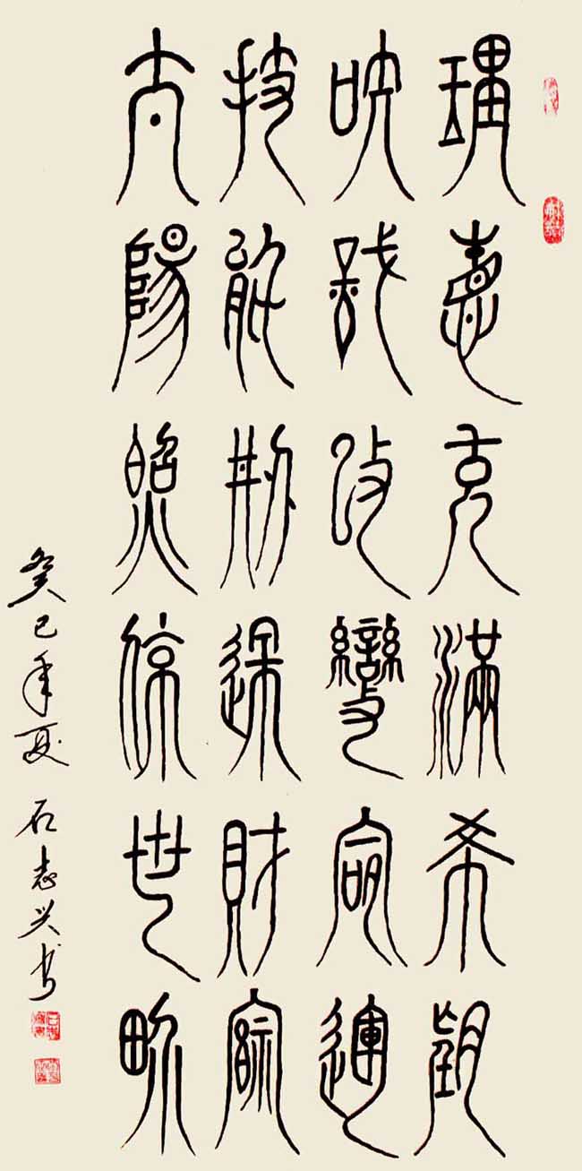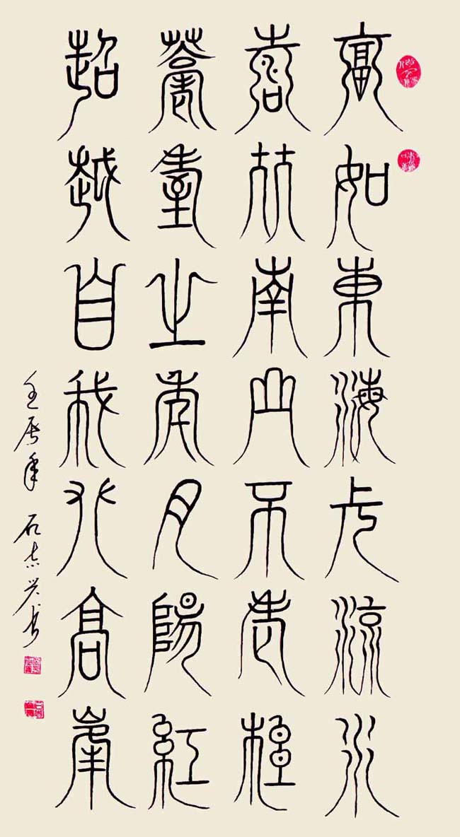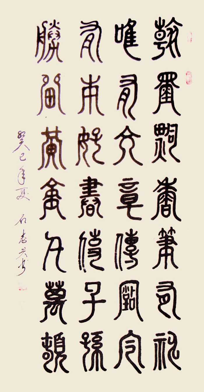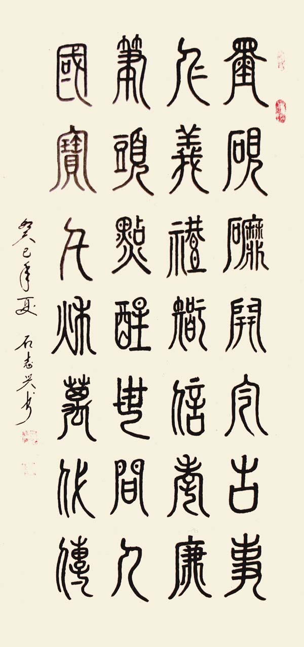 石志兴,男,汉族,1935年生。从事教育事业近四十年。山东省老干部之家书画协会会员,中国老年教育书画研究院院士,中国硬笔书画协会会员。同老伴李长芳,儿子石红旗创作了东方艺术馆、东方图书馆、长青文化馆、中华教育馆、红旗养生馆和名家文艺研究院,任院长。著有《墨宝》、《书法锦集》、《书法宝库》、《书法艺术》、《篆书毛泽东诗集》、《再谱俏夕阳》等十二部著作。曾在王羲之书画报和《老年教育•书画艺术》刊物上发表过书法9篇作品。从2012年至2015年在全国书画大赛中获一等奖、金奖和特等奖23次,发奖盘和证书。其作品已收到国家级的出版社出版的大型的作品集里。评为“繁荣社会主义文化艺术领军人物”、“建设社会主义强国的领军人物"。授予“全国诗文书画先进工作者"、“新中国新时代艺术名家’’和“中外当代文学艺术家百杰人物”等荣誉称号。其名已入编《中国文化传承功勋人物志》、《中国诗文书画家人物大典》和《当代中国文艺家大辞典》。“中国当代名人文化研究会”和“中国传统文化研究和发展促进会”授予“2015全国典型先进模范十佳人物"。国家文化部和人民日报社授予“全国老师代表”荣誉称号,并发毛泽东龙纽玉玺,作为“名家文艺研究院的镇院之宝"。