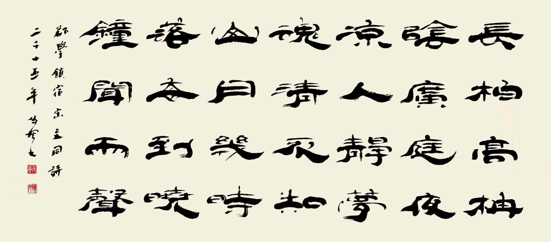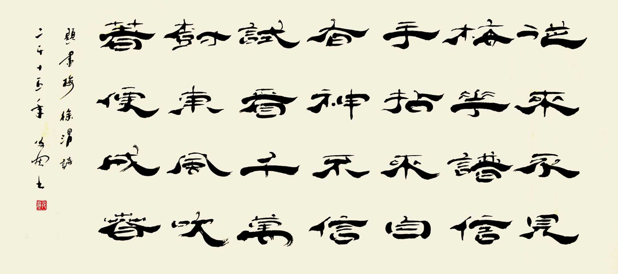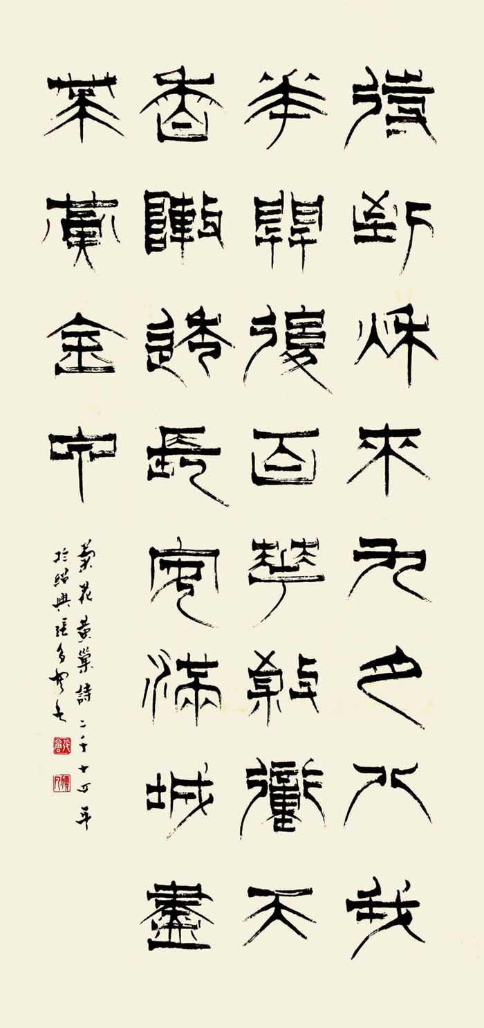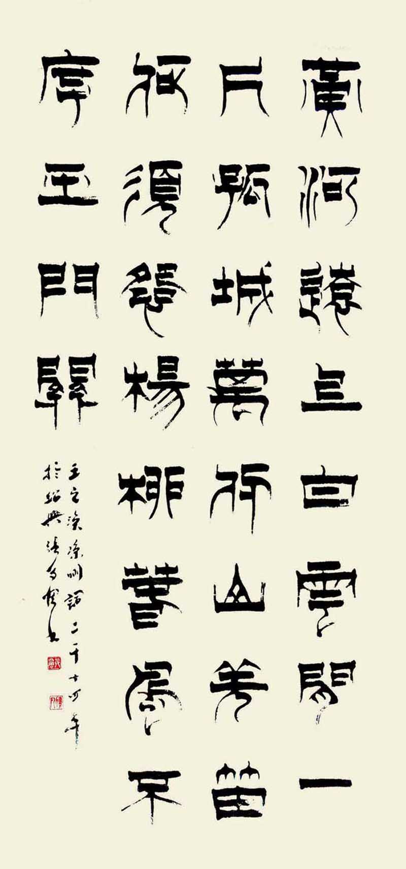 篆书方劲犀利,楷书以魏碑为宗。隶书风格重在立新写意,篆隶结合,创作自我。书风有二:一则追求圆浑雄秀且又富于变化。取纵,横两势。二则笔画纤细劲秀,内松外紧,气势外涨,有《开通褒斜道刻石》之遗风,个性强烈。