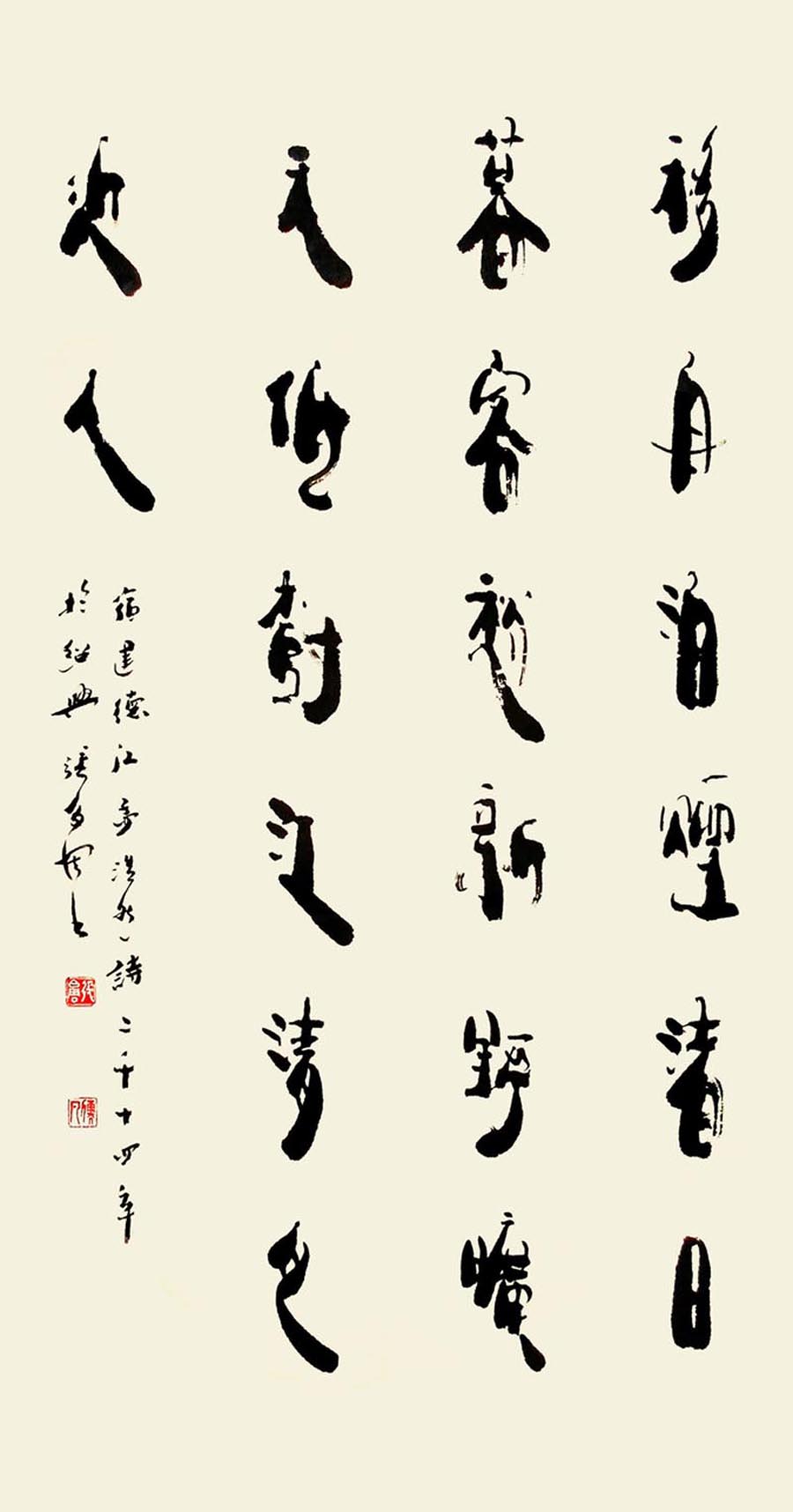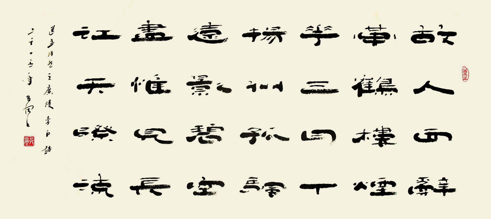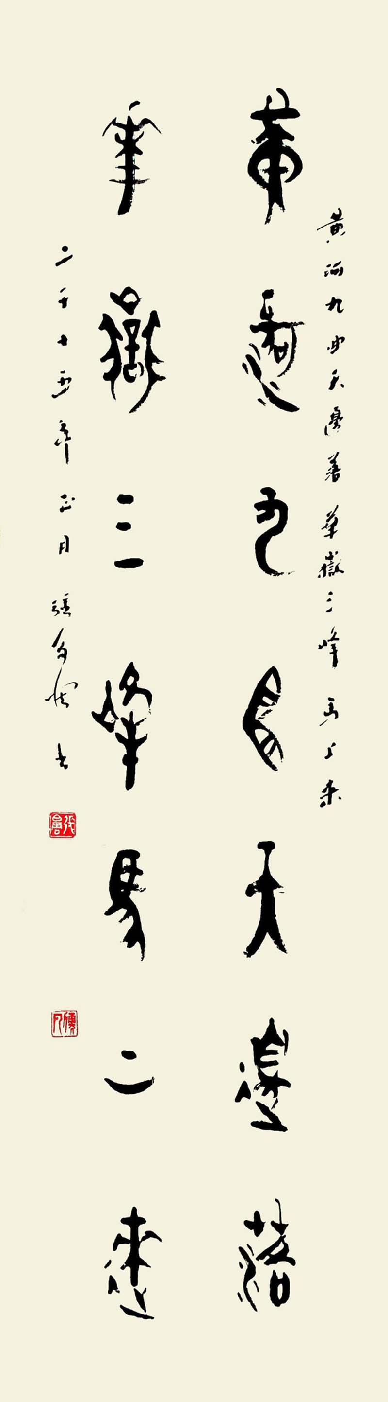 篆书方劲犀利,楷书以魏碑为宗。隶书风格重在立新写意,篆隶结合,创作自我。书风有二:一则追求圆浑雄秀且又富于变化。取纵,横两势。二则笔画纤细劲秀,内松外紧,气势外涨,有《开通褒斜道刻石》之遗风,个性强烈。