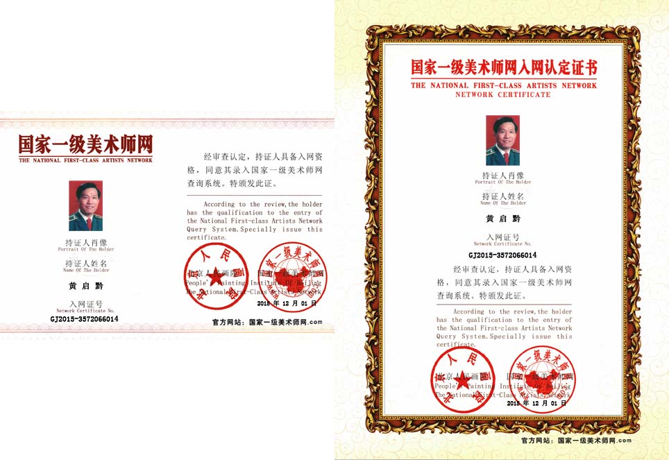 黄启黔,笔名湘黔散人,男,汉族,祖籍湖南。1941年生,经济师。1965年大学毕业从事机关工作。2001年退休。退休后自学绘画理论并开始创作。2007年发表处女作,至今已发表作品百余件,获全国和全球艺术大奖五十余次;取得国家一级书画师、国学艺术大师、共和国十大文艺旗手、当代文艺四大家、中国艺圣、中华艺术巅峰人物、世界文艺大师等数十项荣誉称号。作品入编《中华艺术大师名人辞典》、《国际知名文艺家辞海》等大型辞书五十余部。出版有《湘黔散人画册》、《当代文学四大家黄启黔书画作品选集》、《中国艺圣启功黄启黔双人集》、《中国艺术百年》。现受聘担任中国国学协会终身副主席、首席国学专家;国际汉学专家研究会终身名誉会长、高级研究员、国际汉学首席专家;中国国家诗书画院常务副院长、荣誉院士;世界文化名人研究院名誉院长、文艺博士、高级研究员、名誉院士兼客座教授;国际孔子汉学研究院终身名誉院长、国际汉学名誉博士、名誉院士兼客座教授;中国民族文艺家联合会名誉主席;中国作家创作协会常务副主席;中国名家诗书画院名誉院长、名誉院士兼客座教授;中国老干部作家协会名誉会长;国际华人文艺家协会名誉主席;中央社会文献出版社常务副社长;中央文艺出版社常务副总编辑。