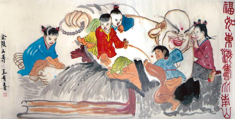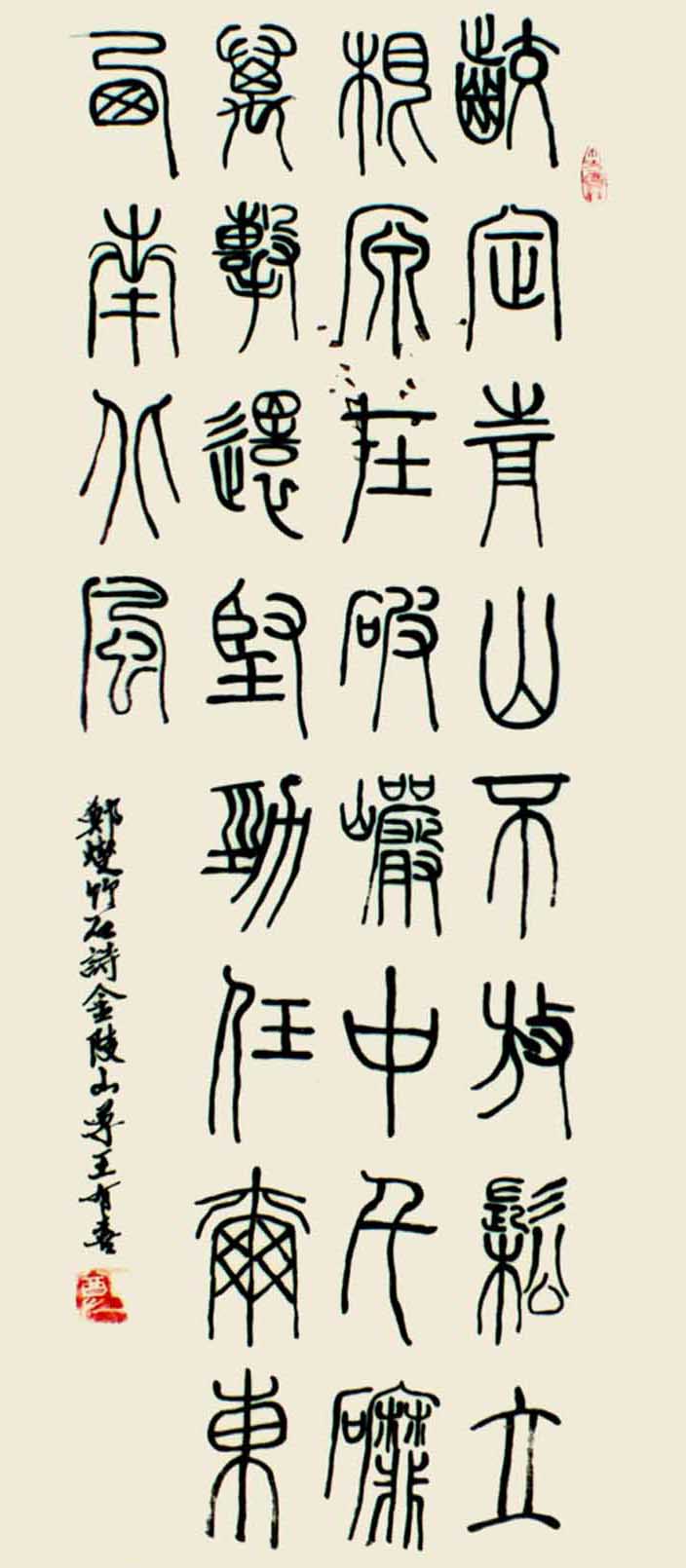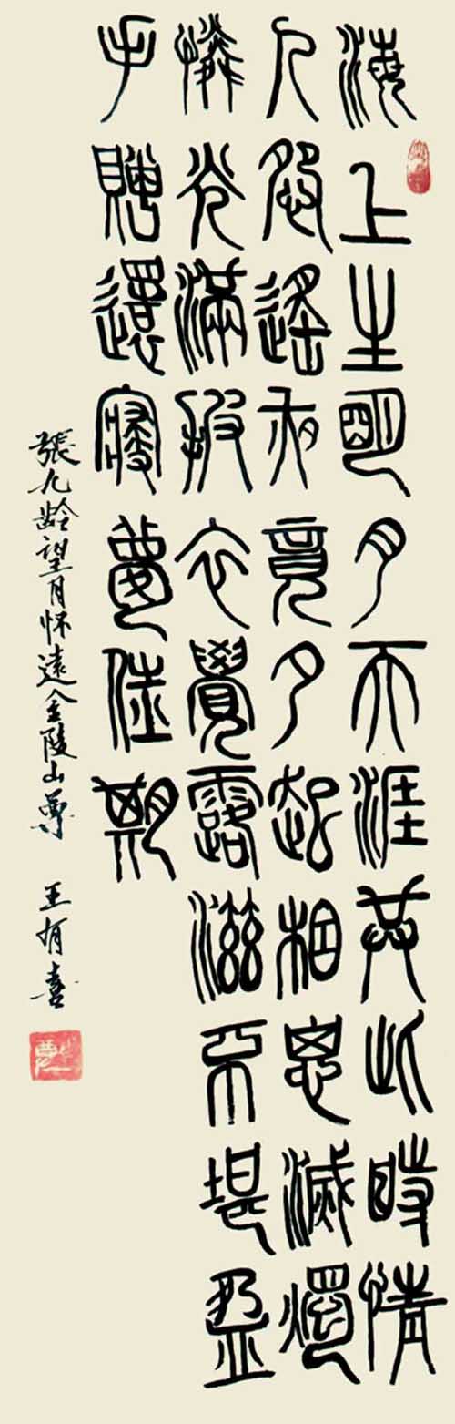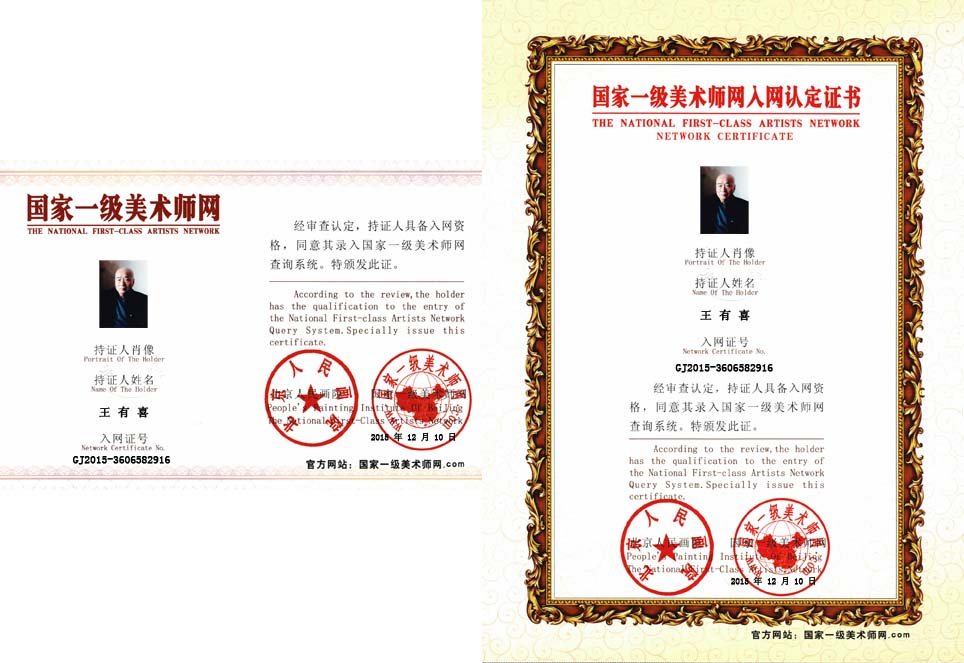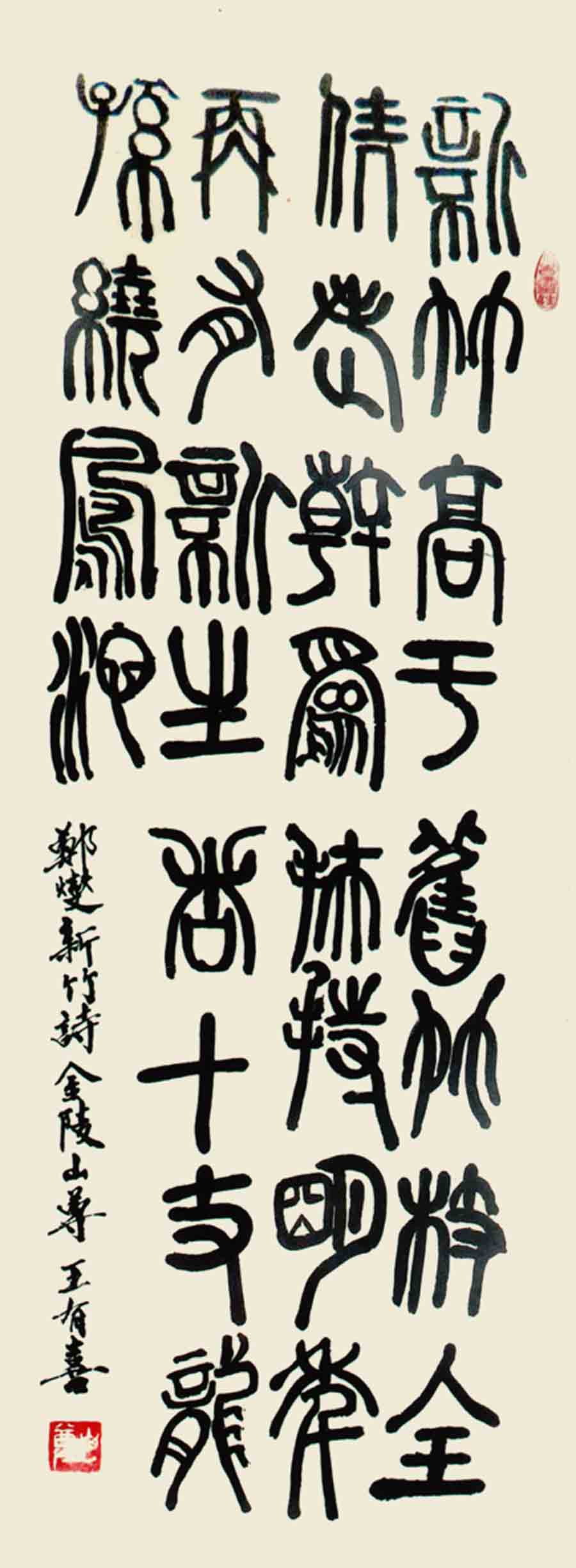 王有喜, 1945年10月生,江苏江都人。60年参加工作,自幼爱好书画,90年任南京电力变压器厂厂长兼党委书记。94年荣获市优秀企业家、市劳动楷模称号,同年练习写毛笔字。95-96因工作劳累在岗位上两次脑梗中风,半身瘫痪。但通过治疗锻炼克服各种困难坚持临摹明清篆书名家字帖10多年,曾参加全国各有关省市书法大赛得十多个金银奖。