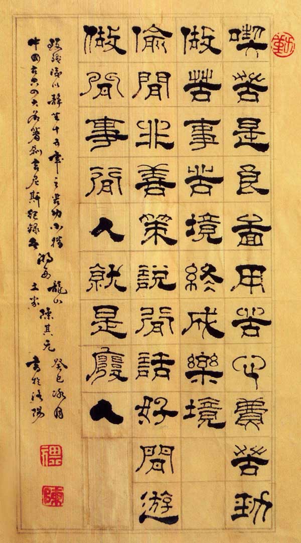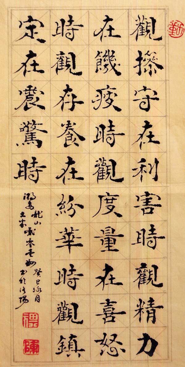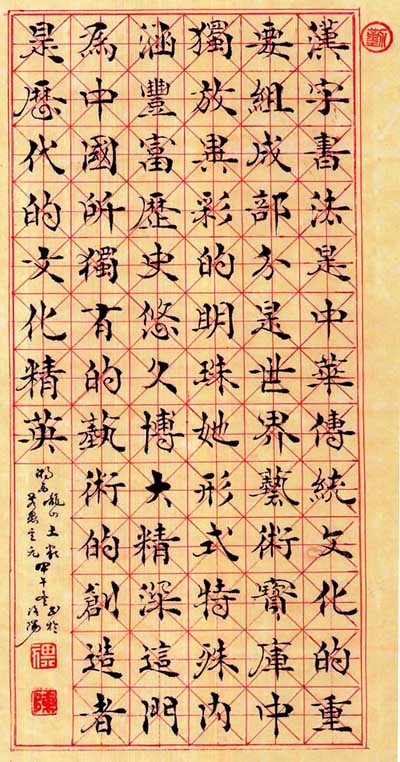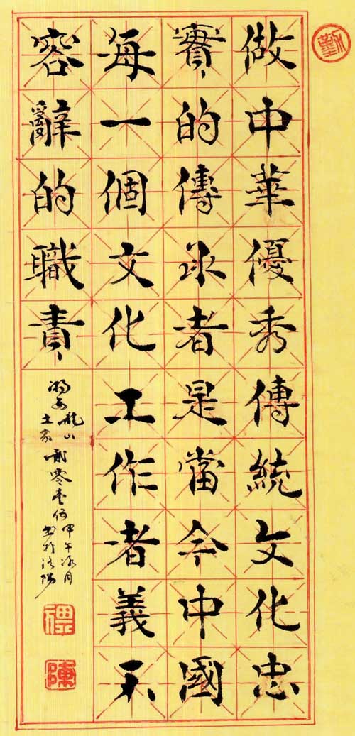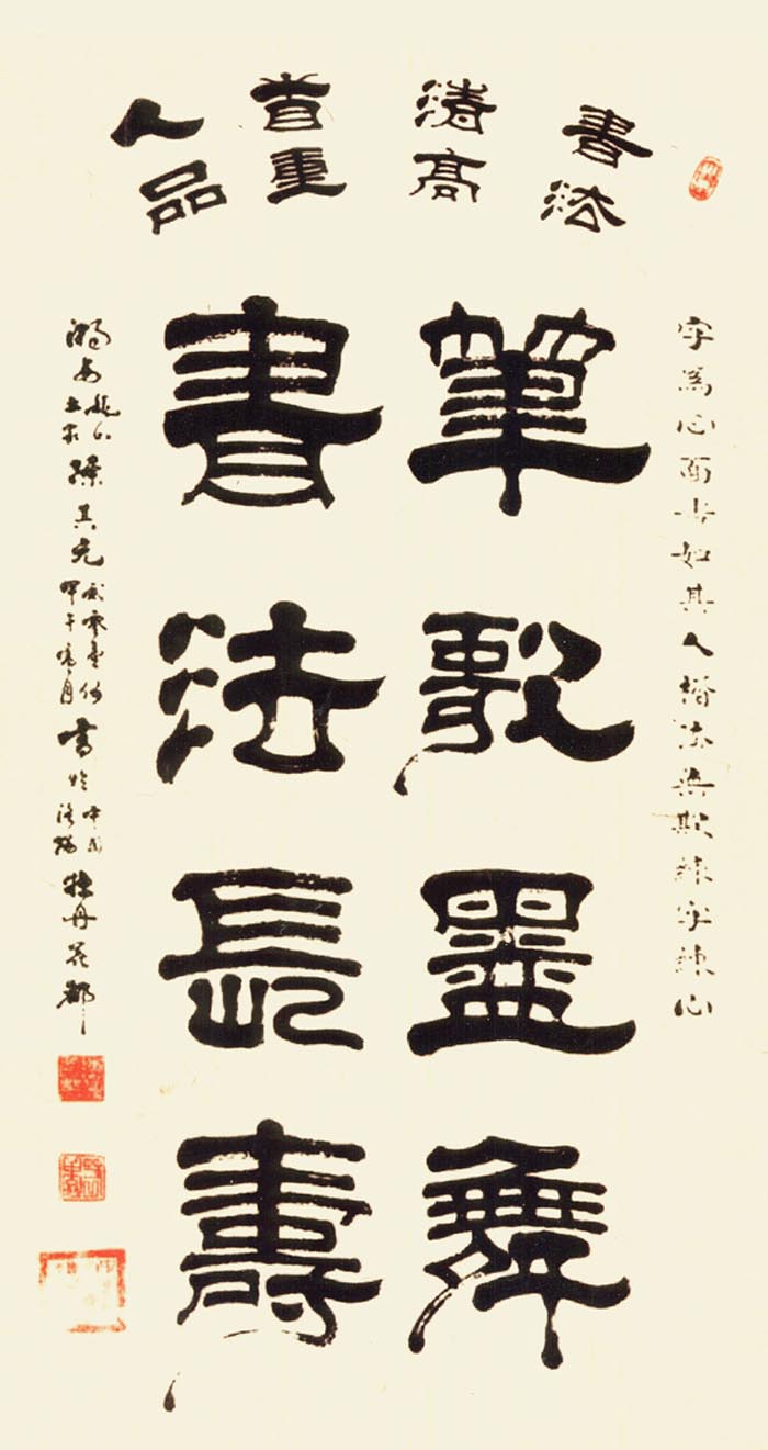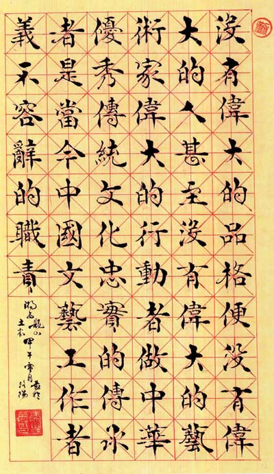 “没有伟大的品格,便没有伟大的人,甚至没有伟大的艺术家,伟大的行动者。”汉字书法是中华传统文化的重要组成部分,是世界艺术宝库中独放异彩的明珠,她形式特殊,内涵丰富,历史悠久,博大精深。田英章先生说“字为心面,书如其人,楷法无欺,练字练心”我终生苦习,决不懈怠。即购徽宣八十刀,决定以3公分小楷复抄“四大名著”,立志再创“国粹”之蓝图,多则十余年定成现实!我有较好的政治背景,曾一直受宠,几掌大印,然多少次大小名利一取即得皆抛弃!我济困扶弱,从不攀上,刚正不阿,一正压万邪!文革初期,我力保校长当选派和所谓有历史问题的教学骨干—德高望重的老教师!我更能单枪匹马、胆大包天地一状告倒胡作非为的毛泽东思想宣传队队长黄某,并将其赶出学校!这在当时的大湘西以至全中国,是无人能所为,无人敢所为的!我力挥笔刀,舌战群刁,一炮轰垮以坚决“捍卫”、坚决“打倒”、破“四旧”、立“四新”为专业,并以暴力抢劫县公安局的枪支,来武装造反派的极左派头目某司令!我“学艺先立品”炼就“字外功”!切齿痛恨官府里的大小老虎、那官商勾结的鼠贼之徒和苍蝇!古今百姓,深恶痛绝的大小官鼠,是风气败坏的根源!是祸国殃民的毒瘤!若惩治不力,必失信于民!我以一技之长,兢兢业业的回报社会和人民,故年年评先,处处破格。我因专一不入仕途,更因正直导致人生坎坷。我在磨难中搏击!在逆境中成才!我为此生没虚度年华,能有所作为而倍感骄傲和自豪!我是当今世上的精神富翁。正是“高山出俊鸟,磨难育英才。”我敢理直气壮地说,我不愧是“影响中国,感动世界”的华夏精英!