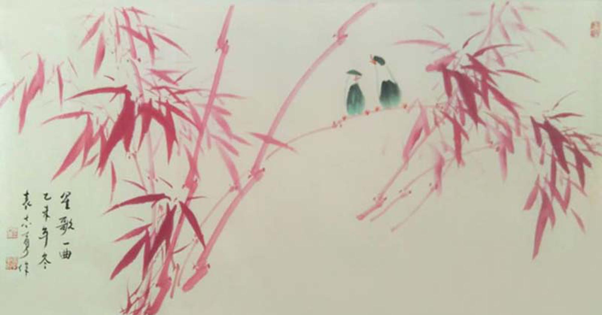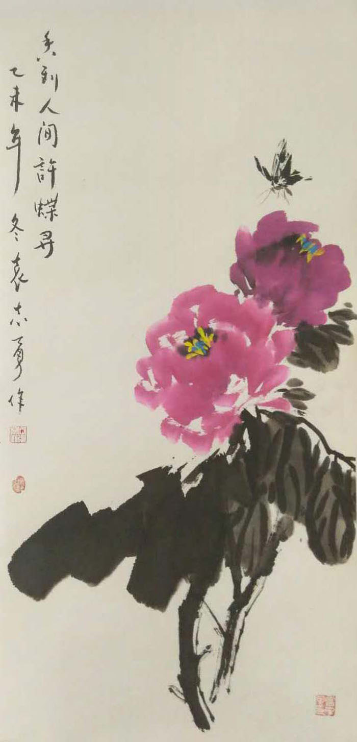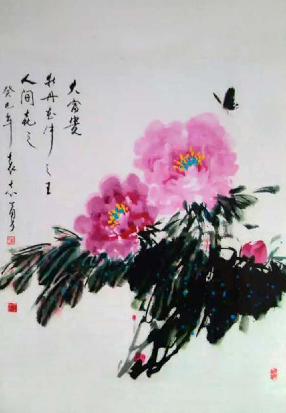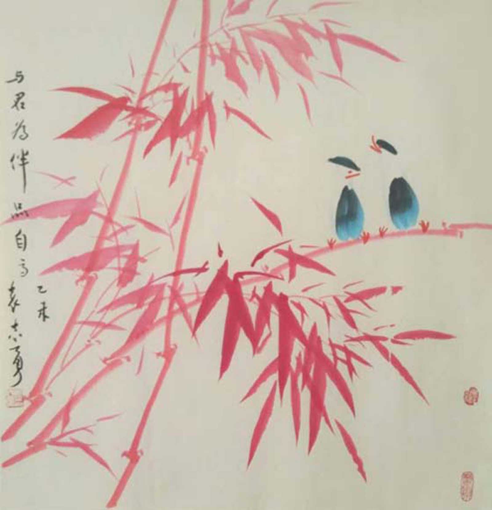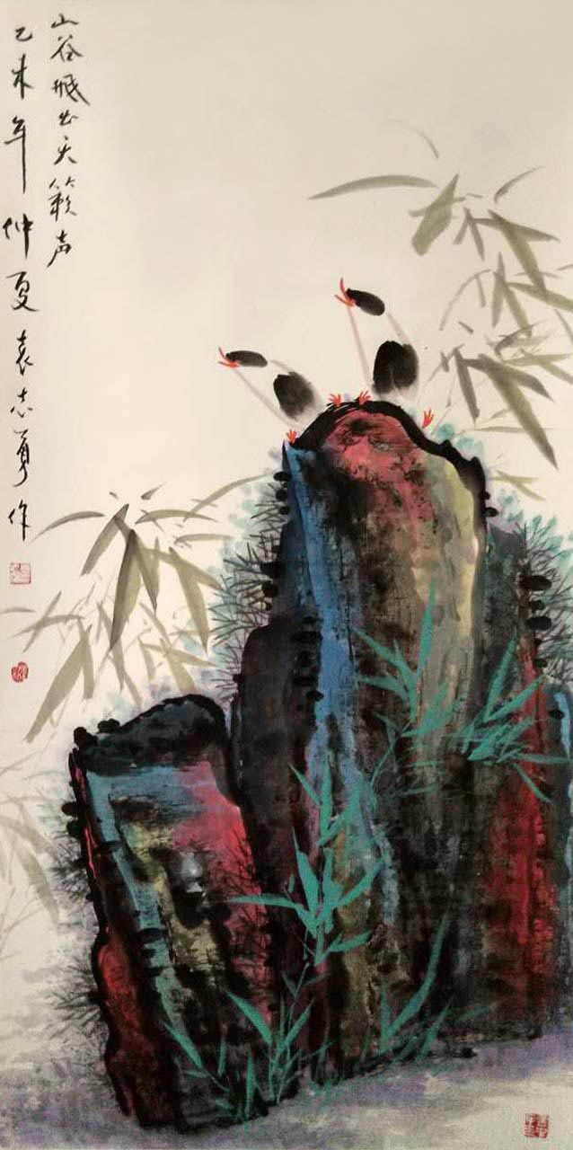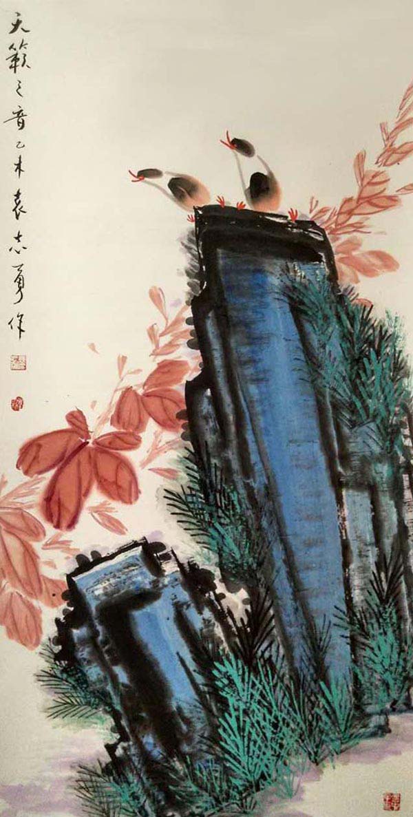 袁志勇作为当代大写意花鸟画家,重视中国画传统的承脉,对中华民族的文化精神有着出色的理解与感悟,经过几十年如一日、对民族传统精神苦苦的追求,探索找到了民族精神与时代精神的契合点,正在形成属于他自己的艺术语言。其画笔墨奔放奇纵,韵致高雅洒脱,意趣生动清纯。在他的花鸟画中我们感受到徐渭的恣肆狂放、信手天成,八大的凝练静穆、简约清脱,吴昌硕的老辣雄奇、古茂朴厚,齐白石的天真烂漫,妙造自然,画面易于理解而又耐人寻味。他尽力保存了传统绘画体系的严整性,而又在以一腔现代人的精神和激情努力从传统脉系中延伸,在题材、意蕴、笔墨、章法上都有着创造性的突破,其作品独具匠心别开生面,呈现出浓烈的时代气息,在中国花鸟画创作相关的文化素养、艺术修养等方面均已达到相当高的境界。