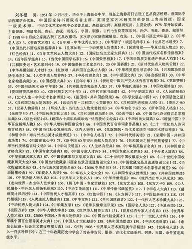 刘冬根,男,1951年12月生,毕业于上海新会中学,现任上海静荷轩古玩工艺品商店经理。兼国际中华收藏学会代表。中国国家诗书画院名誉主席,英国皇家艺术研究院荣誉院士客座教授,国家一级美术师、中华文化艺术研究中心名誉总裁、高级鉴定师、高级研究员。主要业绩:1978年开始收藏,主集银器、明清宝剑、奇石、古砚、雨花石、字画、铜像、古代七宝烧花瓶系列、香炉、玉器、瓷器、邮票等,于1988年8月成立家庭古玩式敢品收藏馆,多次举办家庭收藏展览。