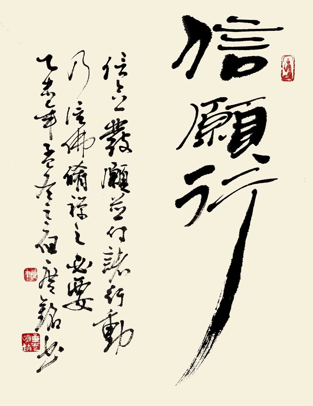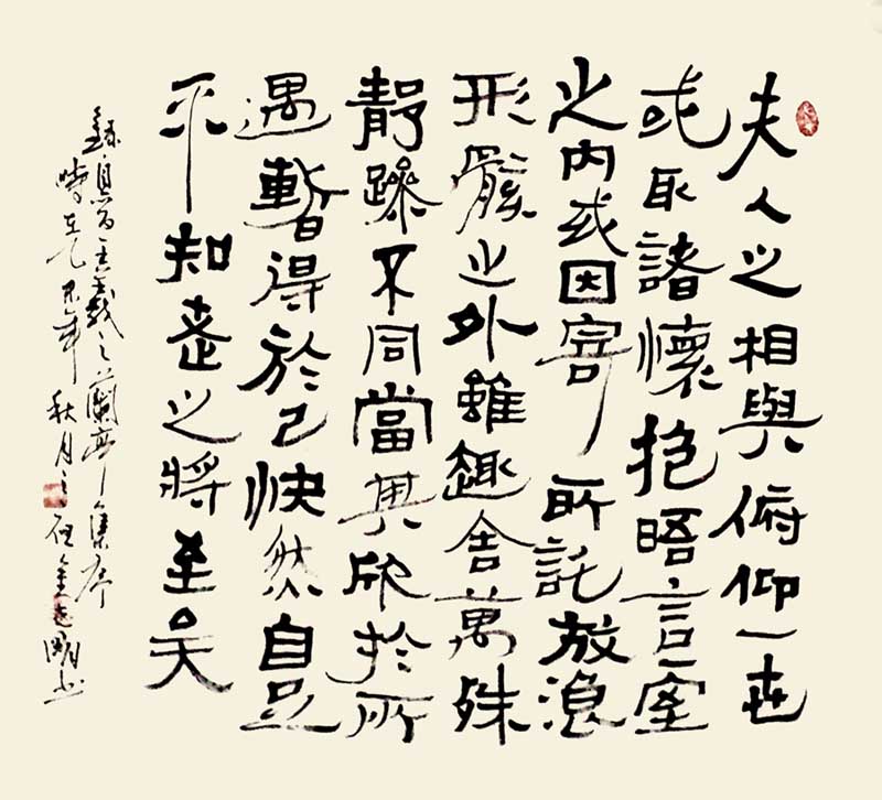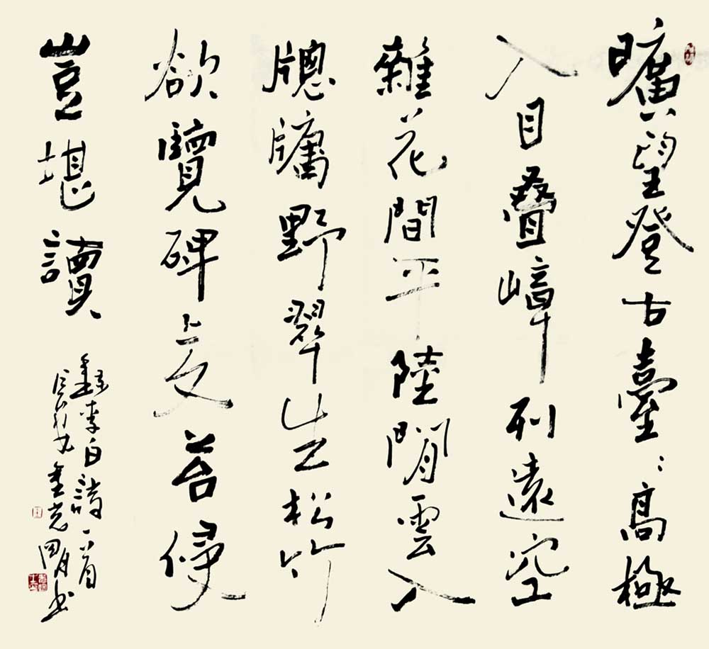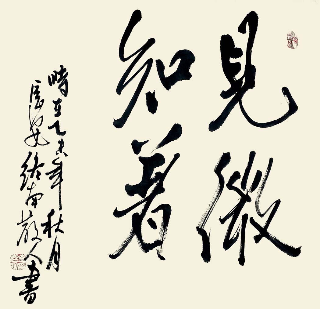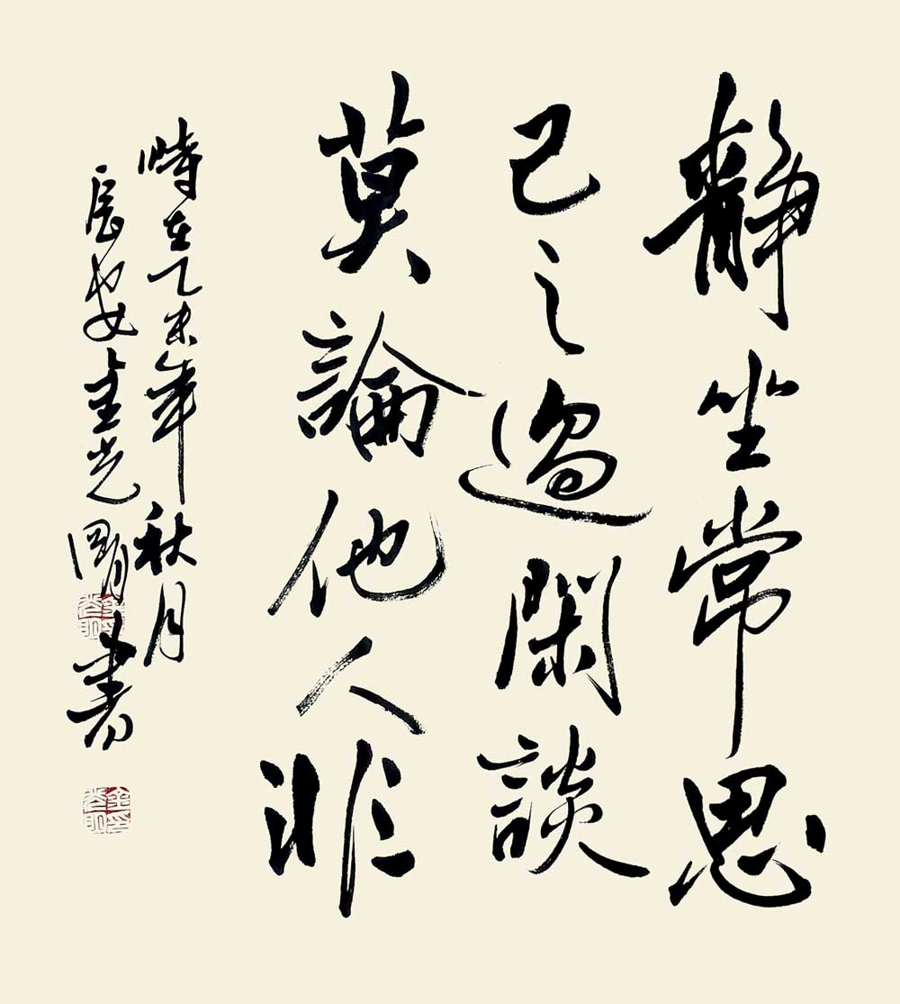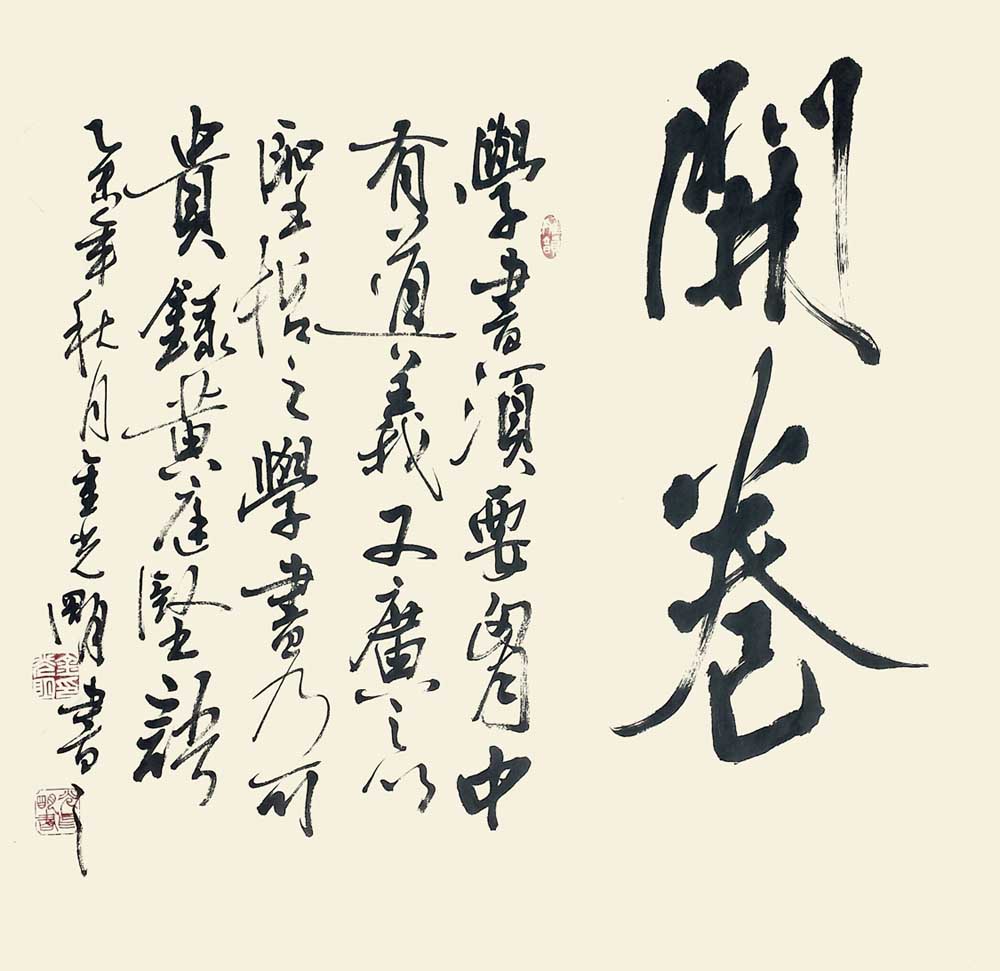 作为与他结交三十多年的老朋友,我自认为是光明几十年书法艺术历程最亲近的见证者。在我看来,他之所以能够在书法艺术上取得这样突出的成绩,除了源自于他在书法艺术上较高的天赋和感悟能力之外,更重要的还得益于他的勤奋和坚持,得益于他良好的古典文化素养,还得益于他沉静、淡泊、超然的艺术心态。他在书法研习的门径方面,从起始阶段,走的就是历代中国文人书法的传统道路。几十年来,他坚持研读和临习古代大家名家的经典法帖和书法名作,但却并不刻意摹仿和简单照搬,而是注重体味和领悟先贤们的精神气质、人文情怀、审美意境,以及章法、笔意、内容与形式之间的关系,等等,并将这些作为自己的艺术营养和借鉴,融会贯通地加以吸收运用。而在艺术创作中,他主要的还是通过书法作品来表达自己的感情和艺术趣味,力图自然从容地表现自己独到的风格与创造。